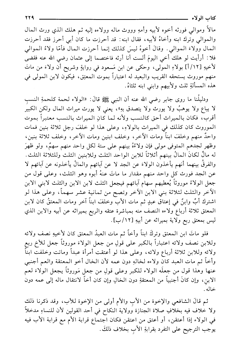 ودليلنا ما روى جابر رضي الله عنه أن النبي - صلى الله عليه وسلم - قال: «الولاء لحمة كلحمة النسب لا يباع ولا يوهب ولا يورث ولا يتصدق به»، يعني لا يورث ميراث المال ولكن الكبير أقرب، فكان بالميراث أحق كالنسب ولأنه لما كان الميراث بالنسب معتبرًا بموت الموروث كان كذلك في الميراث بالولاء، وعلى هذا لو خلف رجل ثلاثة بنين فمات واحد منهم وخلف ابنًا ومات الآخر، وخلف ابنين ومات الآخر، وخلف ثلاثة بنين، وظهر لجدهم المتوفى مولى فإن ولاءه بينهم على ستة لكل واحد منهم سهم، ولو ظهر له مال لكان المال بينهم أثلاثًا للابن الواحد الثلث وللابنين الثلث وللثلاثة الثل. والفرق بينهما أنهم يأخذون الولاء عن الجد لا عن آبائهم والمال يأخذونه عن آبائهم لا عن الجد فورث كل واحد منهم مقدار ما مات عنه أبوه وهو الثلث، وعلى قوله من جعل الولاء موروثا يعطيهم سهام آبائهم فيجعل الثلث لابن الابن والثلث لابني الابن الآخر والثلث لثلاثة بني الابن الآخر وتصح من ثمانية عشر سهمًا، وعلى هذا لو اشترك أب وابن في إعتاق عبد ثم مات الأب وخلف ابنًا آخر ومات المعتق كان لابن المعتق ثلاثة أرباع ولاءه النصف منه بمباشرة عتقه والربع بميراثه عن أبيه والابن الذي ليس بمعتق ربع ولاية بميراثه عن أبيه [12/ ب].