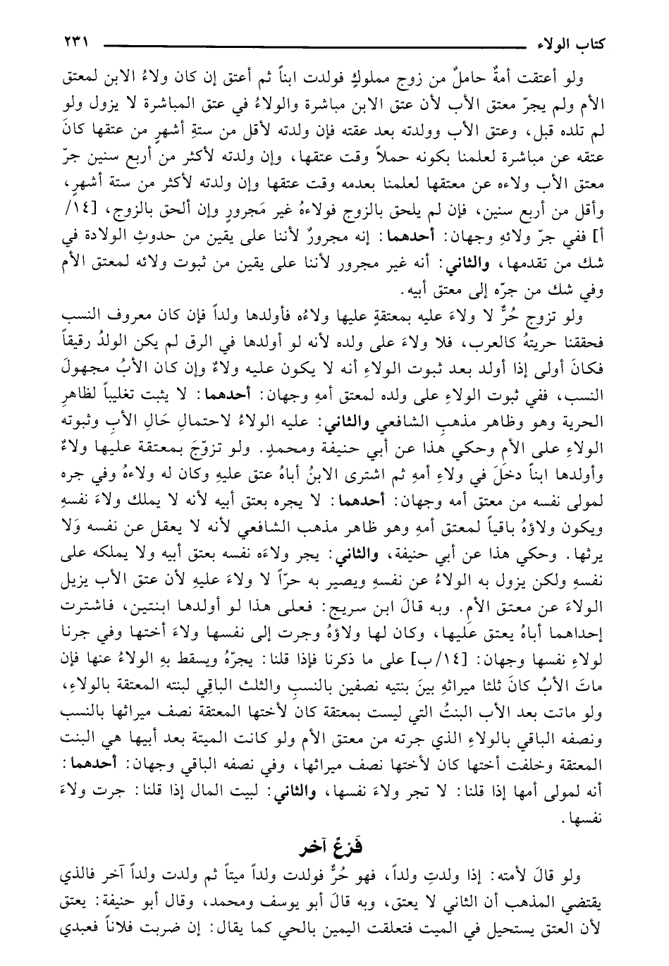 ولو أعتقت أمة حامل من زوج مملوك فولدت ابنًا ثم أعتق إن كان ولاء الابن لمعتق الأم ولم يجر معتق الأب لأن عتق الابن مباشرة والولاء في عتق المباشرة لا يزول ولو لم تلده قبل، وعتق الأب وولدته بعد عتقه فإن ولدته لأقل من سنة أشهر من عتقها كان عتقه عن مباشرة لعلمنا بكونه حملا وقت عتقها، وإن ولدته لأكثر من أربع سنين جر معتق الأب ولاءه عن معتقها لعلمنا بعدمه وقت عتقها وإن ولدته لأكثر من ستة أشهر، وأقل من أربع سنين، فإن لم يلحق بالزوج فولاءه غير مجرور وإن ألحق بالزوج، [14/ أ] ففي جر ولائه وجهان: أحدهما: إنه مجرور لأننا على يقين من حدوث الولادة في شك من تقدمها، والثاني: أنه غير مجرور لأننا على يقين من ثبوت ولائه لمعتق الأم وفي شك من جره إلى معتق أبيه.