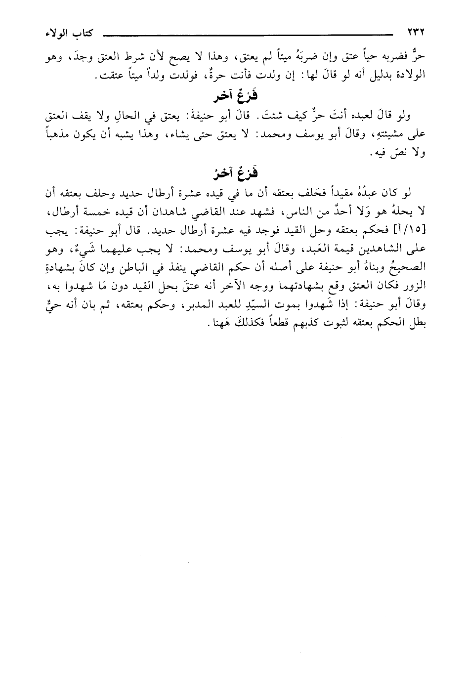 لو كان عبده مقيدا فحله بعتقه أن ما في قيده عشرة أرطال حديد وحلف بعتقه أن لا يحله هو ولا أحد من الناس، فشهد عند القاضي شاهدان أن قيده خمسة أركال، [15/ أ] فحكم بعتقه وحل القيد فوجد فيه عشرة أرطال حديد. قال أبو حنيفة: يجب على الشاهدين قيمة العبد، وقال أبو يوسف ومحمد: لا يجب عليهما شيء، وهو الصحيح وبناه أبو حنيفة على أصله أن حكم القاضي ينفذ في الباطن وإن كان بشهادة الزور فكان العتق وقع بشهادتهما ووجه الآخر أنه عتق بحل القيد دون ما شهدوا به، وقال أبو حنيفة: إذا شهدوا بموت السيد للعبد المدبر، وحكم بعتقه، ثم بان أنه حي بطل الحكم بعتقه لثبوت كذبهم قطعًا فكذلك ههنا.