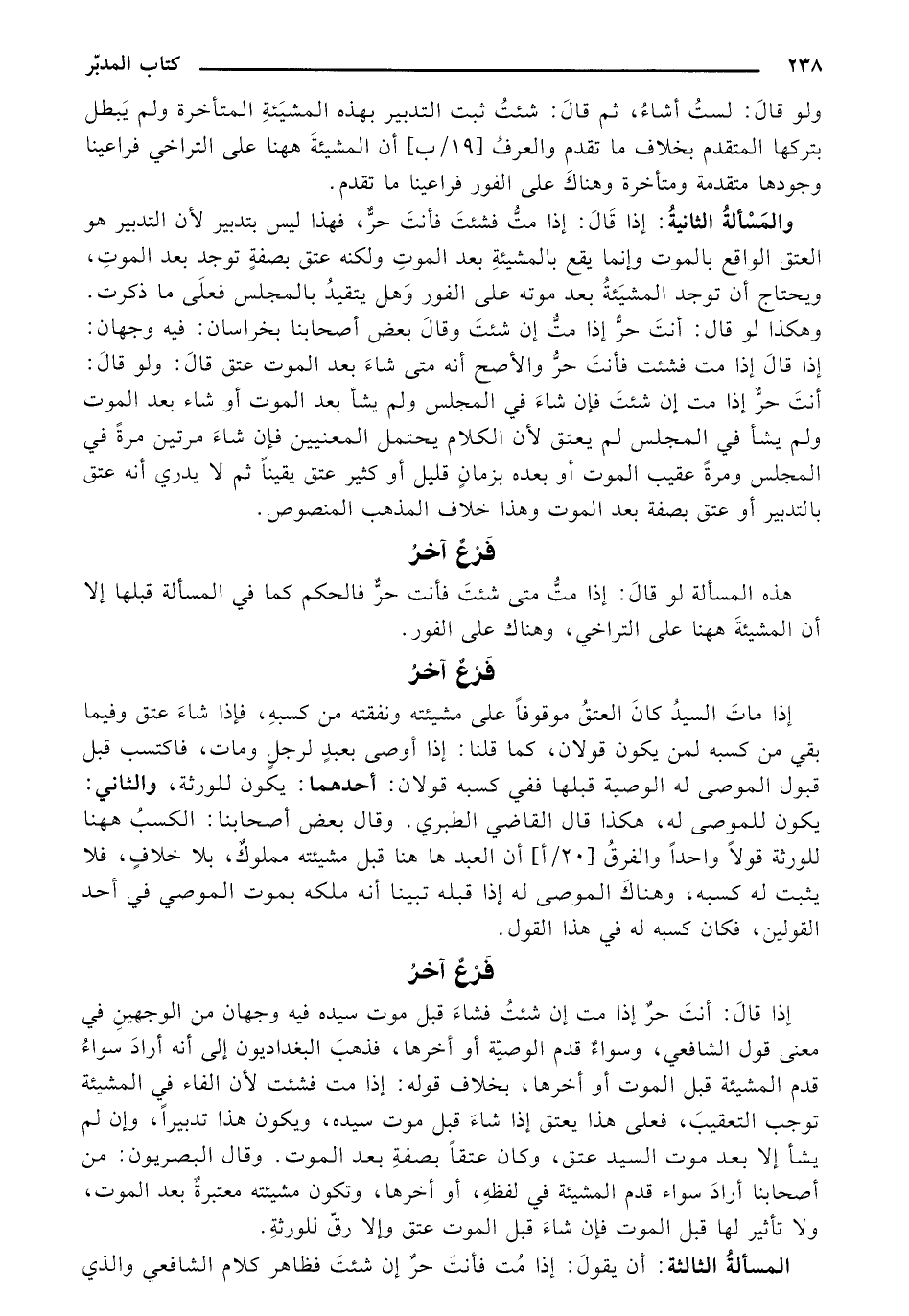 والمسألة الثانية: إذا قال: إذا مت فشئت فأنت حر، فهذا ليس بتدبير لأن التدبير هو العتق الواقع بالمواقع بالموت وإنما يقع بالمشيئة بعد الموت ولكنه عتق بصفة توجد بعد الموت، ويحتاج أن توجد المشيئة بعد موته على الفور وهل يتقيد بالمجلس فعلى ما ذكرت. وهكذا لو قال: أنت حر إذا مت إن شئت وقال بعض أصحابنا بخراسان: فيه وجهان: إذا قال إذا مت فشئت فأنت حر والأصح أنه متى شاء بعد الموت عتق قال: ولو قال: أنت حر إذا مت إن شئت فإن شاء في المجلس ولم يشأ بعد الموت أو شاء بعد الموت ولم يشأ في المجلس لم يعتق لأن الكلام يحتمل المعنيين فإن شاء مرتين مرة في المجلس ومرة عقبيب الموت أو بعده بزمان قليل أو كثير عتق يقينًا ثم لا يدري أنه عتق بالتدبير أو عتق بصفة بعد الموت وهذا خلاف المذهب المنصوص.