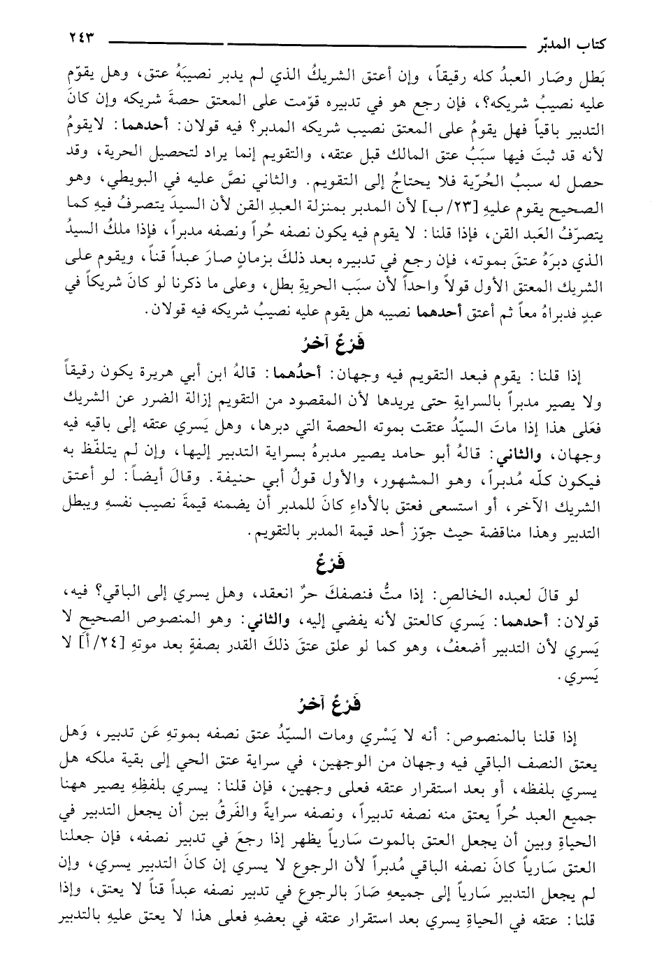 إذا قلنا: يقوم فبعد التقويم فيه وجهان: أحدهما: قاله ابن أبي هريرة يكون رقيقًا ولا يصير مدبرًا بالسراية حتى يريدها لأن المقصود من التقويم إزالة الضرر عن الشريك فعلى هذا إذا مات السيد عتقت بموته الحصة التي دبرها، وهل يسري عتقه إلى باقيه فيه وجهان، والثاني: قاله بأو حامد يصير مدبره بسراية التدبير إليها، وإن لم يتلفظ به فيكون كله مدبرًا، وهو المشهور، والأول قول أبي حنيفة. وقال أيضا: لو أعتق الشريك الآخر، أو استسعى فعتق بالأداء كان للمدبر أن يضمنه قيمة نصيب نفسه ويبطل التدبير وهذا مناقضة حيث جوز أحد قيمة المدبر بالتقويم.