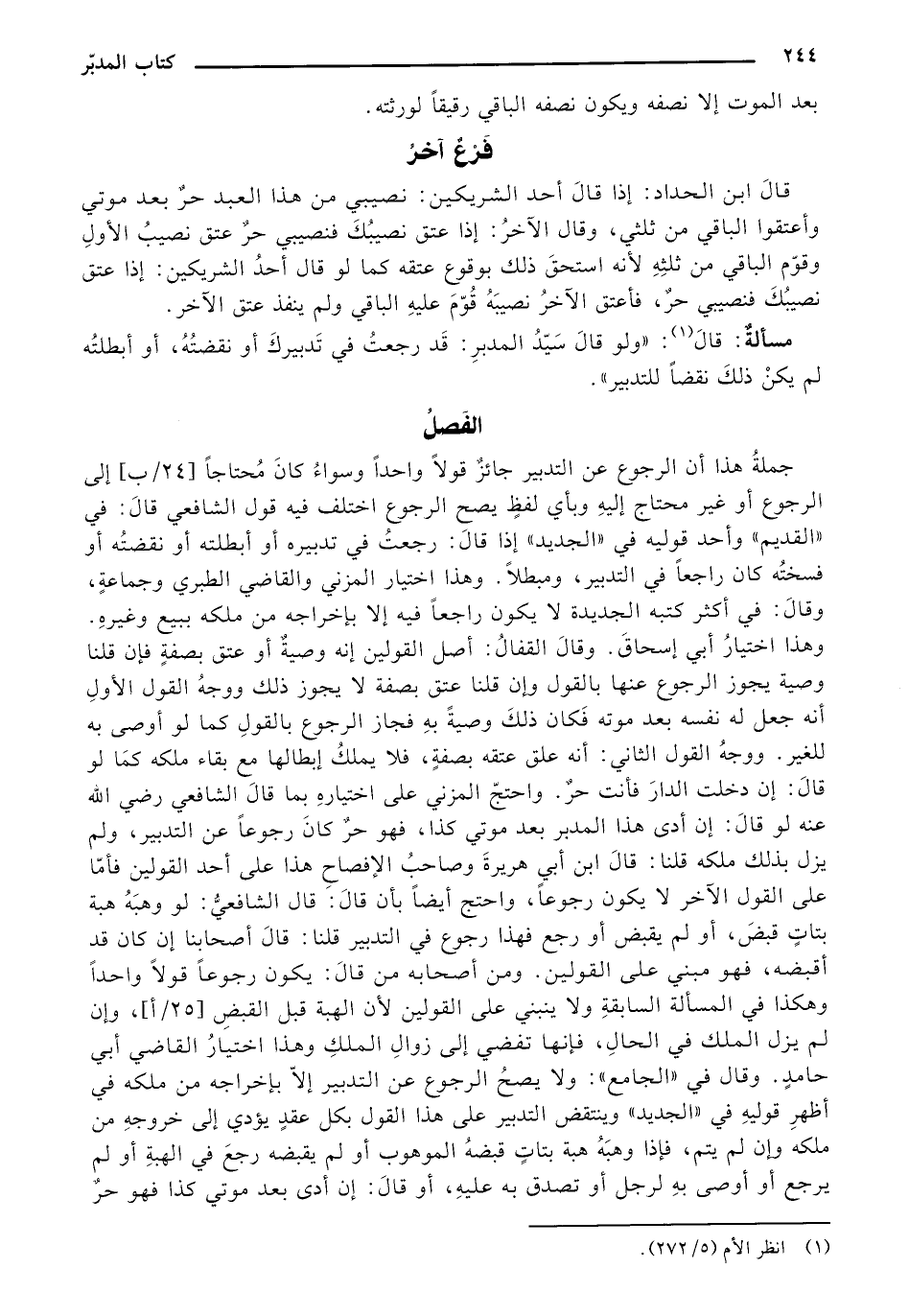 جملة هذا أن الرجوع عن التدبير جائز قولاً واحدًا وسواء كان محتاجًا [24/ ب] إلى الرجوع أو غير محتاج إليه وبأي لفظ يصح الرجوع اختلف فيه قول الشافعي قال: في «القديم» وأحد قوليه في «الجديد» إذا قال: رجعت في تدبيره أو أبطلته أو نقضته أو فسخته كان راجعًا في التدبير، ومبطلاً. وهذا اختيار المزني والقاضي والطبري وجماعة، وقال: في أكثر كتبه الجديدة لا يكون راجعًا فيه إلا بإخراجه من ملكه ببيع وغيره. وهذا اختيار أبي إسحاق. وقال القفال: أصل القولين إنه وصية أو عتق بصفة فإن قلنا وصية يجوز الرجوع عنها بالقول وإن قلنا عتق بصفة لا يجوز ذلك ووجه القول الأول أنه جعل له نفسه بعد موته فكان ذلك وصية به فجاز الرجوع بالقول كما لو أوصى به للغير. ووجه القول الثاني: أنه علق عتقه بصفة، فلا يملك إبطالها مع بقاء ملكه كما لو قال: إن دخلت الدار فأنت حر. واحتج المزني على اختياره بما قال الشافعي رضي الله عنه لو قال: إن أدى هذا المدبر بعد موتي كذا، فهو حر كان رجوعًا عن التدبير، ولم يزل بذلك ملكه قلنا: قال ابن أبي هريرة وصاحب الإفصاح هذا على أحد القولين فأما على القول الآخر لا يكون رجوعًا، واحتج أيضًا بأن قال: قال الشافعي: لو وهبه هبة بتات قبض، أو لم يقبض أو رجع فهذا رجوع في التدبير قلنا: قال أصحابنا إن كان قد أقبضه، فهو مبني على القولين. ومن أصحابه من قال: يكون رجوعًا قولا واحدًا وهكذا في المسألة السابقة ولا ينبني على القولين لأن الهبة قبل القبض [28/ أ]، وإن لم يزل الملك في الحال، فإنها تفضي إلى زوال الملك وهذا اختيار القاضي أبي حامد. وقال في «الجامع»: ولا يصح الرجوع عن التدبير إلا بإخراجه من ملكه في أظهر قوليه في «الجديد» وينتقض التدبير على هذا القول بكل عقد يؤدي إلى خروجه من ملكه وإن لم يتم، فإذا وهبه هبة بتات قبضه الموهوب أو لم يقبضه رجع في الهبة أو لم يرجع أو أوصى به لرجل أو تصدق به عليه، أو قال: إن أدى بعد موتي كذا فهو حر