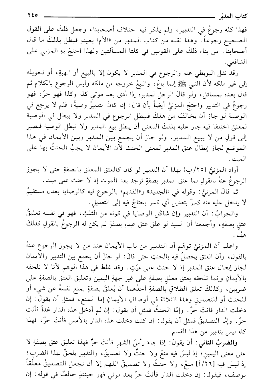 فهذا كله رجوع في التبدير، ولم يذكر فيه اختلاف أصحابنا، وجعل ذلك على القول الصحيح رجوعًا. وهذا نقله من كتاب المدبر من «الأم» بعينه فبطل بذلك ما قال أصحابنا: من بناء ذلك على القولين في كلتا المسألتين ولهذا احتج به المزني على الشافعي.