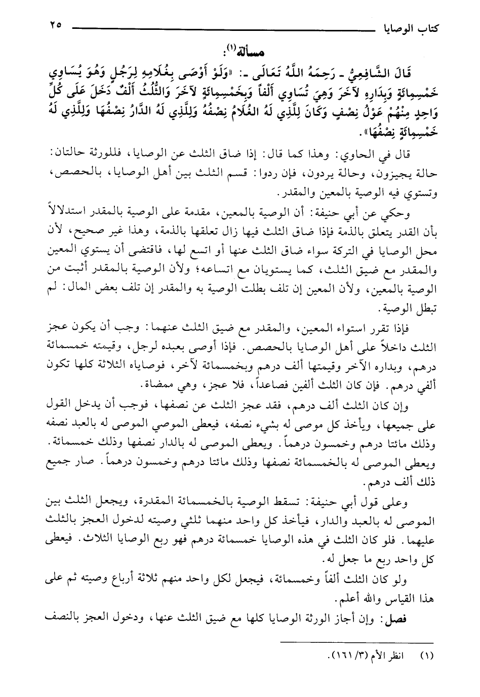قال الشافعي -رحمه الله تعالى-: «ولو أوصي بغلامه لرجل وهو يساوي خمسمائة وبداره لآخر وهي تساوي ألفًا وبخمسمائة لآخر والثلث ألف دخل على كل واحدٍ منهم عول نصف وكان للذي له الغلام نصفه وللذي له الدار نصفها وللذي له خمسمائة نصفها».