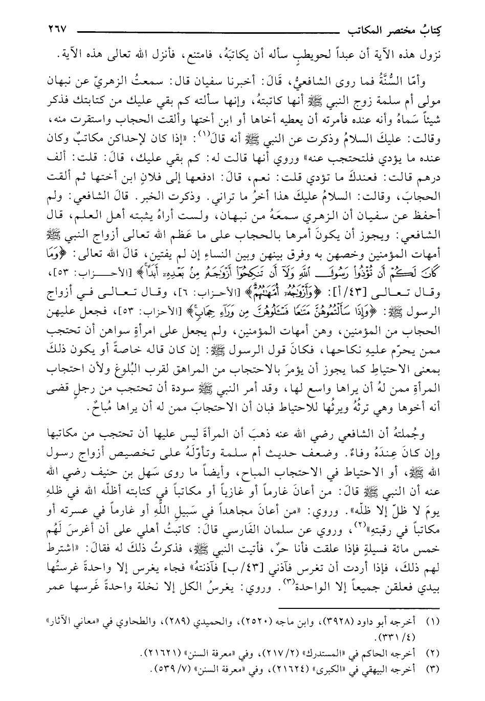 وأما السنة فما روى الشافعي، قال: أخبرنا سفيان قال: سمعت الزهري عن نبهان مولى أم سلمة زوج النبي - صلى الله عليه وسلم - أنها كاتبته، وإنما سألته كم بقي عليك من كتابتك فذكر شيئا سماه وأنه عنده فأمرته أن يعطيه أخاها أو ابن أختها وألقت الحجاب واستقرت منه، وقالت عليك السلام وذكرت عن النبي - صلى الله عليه وسلم - أنه قال: «إذا كان لإحداكن مكاتب وكان عنده ما يؤدي فلتحتجب عنه» وروي أنها قالت له: كم بقي عليك، قال: قلت: ألف درهم قالت: فعندك ما تؤدي قلت: نعم، قال: ادفعها إلى فلان ابن أختها ثم ألقت الحجاب، وقالت: السلام عليك هذا أخر ما تراني. وذكرت الخبر. قال الشافعي: ولم أحفظ عن سفيان أن الزهري سمعه من نبهان، ولست أراه يثبته أهل العلم، قال الشافعي: ويجوز أن يكون أمرها بالحجاب على ما عظم الله تعالى أزواج النبي - صلى الله عليه وسلم - أمهات المؤمنين وخصهن به وفرق بينهن وبين النساء إن لم يفتين، قال الله تعالى: {ومَا كَانَ لَكُمْ أَن تُؤْذُوا رَسُولَ اللَّهِ ولا أَن تَنكِحُوا أَزْوَاجَهُ مِنْ بَعْدِهِ أَبَدًا} [الأحزاب: 53]، وقال تعالى [43/ أ]: {وأَزْوَاجُهُ أُمَّهَاتُهُمْ} [الأحزاب: 6]، وقال تعالى في أزواج الرسول - صلى الله عليه وسلم -: {وإذَا سَأَلْتُمُوهُنَّ مَتَاعًا فَاسْأَلُوهُنَّ مِن ورَاءِ حِجَابٍ} [الأحزاب: 53]، فجعل عليهن الحجاب من المؤمنين، وهن أمهات المؤمنين، ولم يجعل على امرأة سواهن أن تحتجب ممن يحرم عليه نكاحها، فكان قول الرسول - صلى الله عليه وسلم -: إن كان قاله خاصة أو يكون ذلك بمعنى الاحتياط كما يجوز أن يؤمر بالاحتجاب من المراهق لقرب البلوغ ولأن احتجاب المرأة ممن له أن يراها واسع لها، وقد أمر النبي - صلى الله عليه وسلم - سودة أن تحتجب من رجل قضى أنه أخوها وهي ترثه ويرثها للاحتياط فبان أن الاحتجاب ممن له أن يراها مباح.