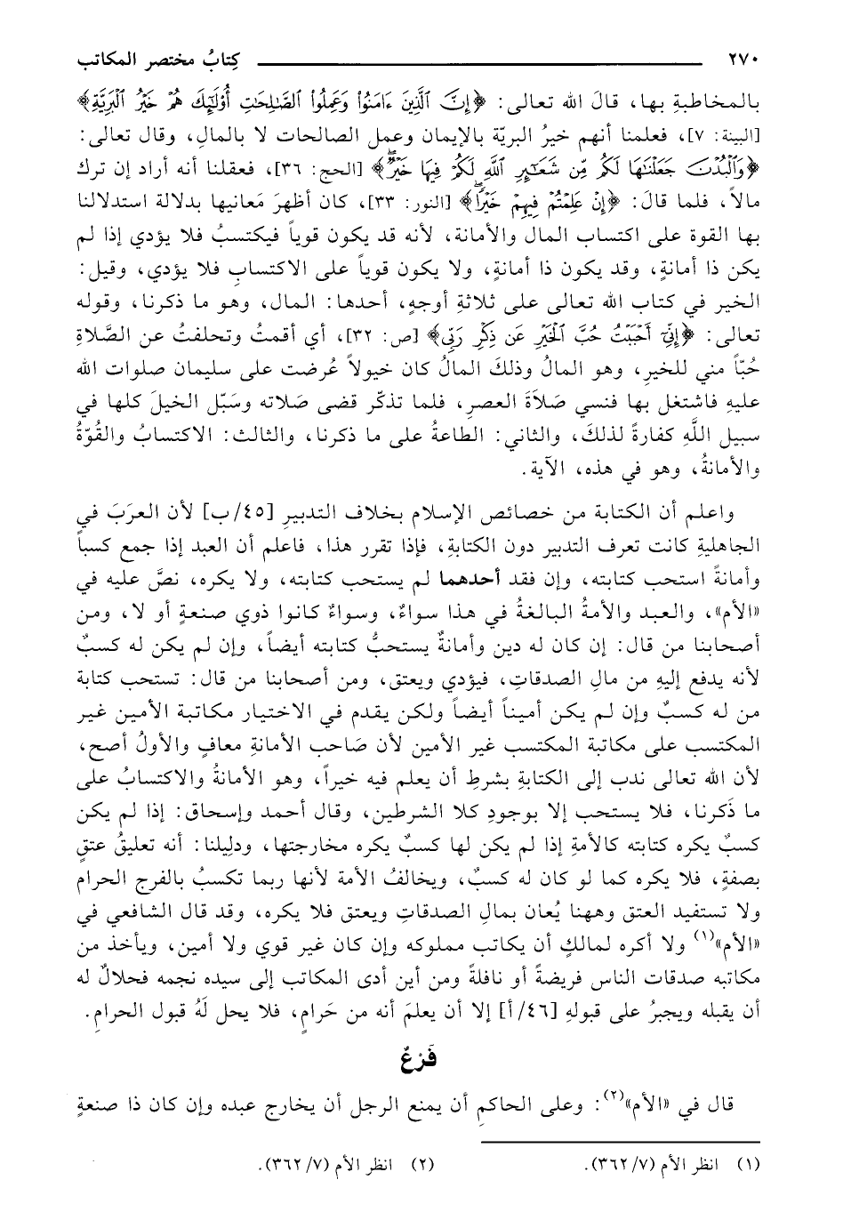 واعلم أن الكتابة من خصائص الإسلام بخلاف التدبير [45/ ب] لأن العرب في الجاهلية كانت تعرف التدبير دون الكتابة، فإذا تقرر هذا، فاعلم أن العبد إذا جمع كسبًا وأمانة استحب كتابته، وإن فقد أحدهما لم يستحب كتابته، ولا يكره، نص عليه في «الأم»، والعبد والأمة البالغة في هذا سواء، وسواء كانوا ذوي صنعة أو لا، ومن أصحابنا من قال: إن كان له دين وأمانة يستحب كتابته أيضًا، وإن لم يكن له كسب لأنه يدفع إليه من مال الصدقات، فيؤدي ويعتق، ومن أصحابنا من قال: تستحب كتابة من له كسب وإن لم يكن أمينًا أيضًا ولكن يقدم في الاختيار مكاتبة الأمين غير المكتسب على مكاتبة المكتسب غير الأمين لأن صاحب الأمانة معاف والأول أصح، لأن الله تعالى ندب إلى الكتابة بشرط أن يعلم فيه خيرًا، وهو الأمانة والاكتساب على ما ذكرنا، فلا يستحب إلا بوجود كلا الشرطين، وقال أحمد وإسحاق: إذا لم يكن كسب يكره كتابته كالأمة إذا لم يكن لها كسب يكره مخارجتها، ودليلنا: أنه تعليق عتق بصفة، فلا يكره كما لو كان له كسب، ويخالف الأمة لأنها ربما تكسب بالفرج الحرام ولا تستفيد العتق وههنا يعان بمال الصدقات ويعتق فلا يكره، وقد قال الشافعي في «الأم» ولا أكره لمالك أن يكاتب مملوكه وإن كان غير قوي ولا أمين، ويأخذ من مكاتبه صدقات الناس فريضة أو نافلة ومن أين أدى المكاتب إلى سيده نجمه فحلال له أن يقبله ويجبر على قبوله [46/ أ] إلا أن يعلم أنه من حرام، فلا يحل له قبول الحرام.