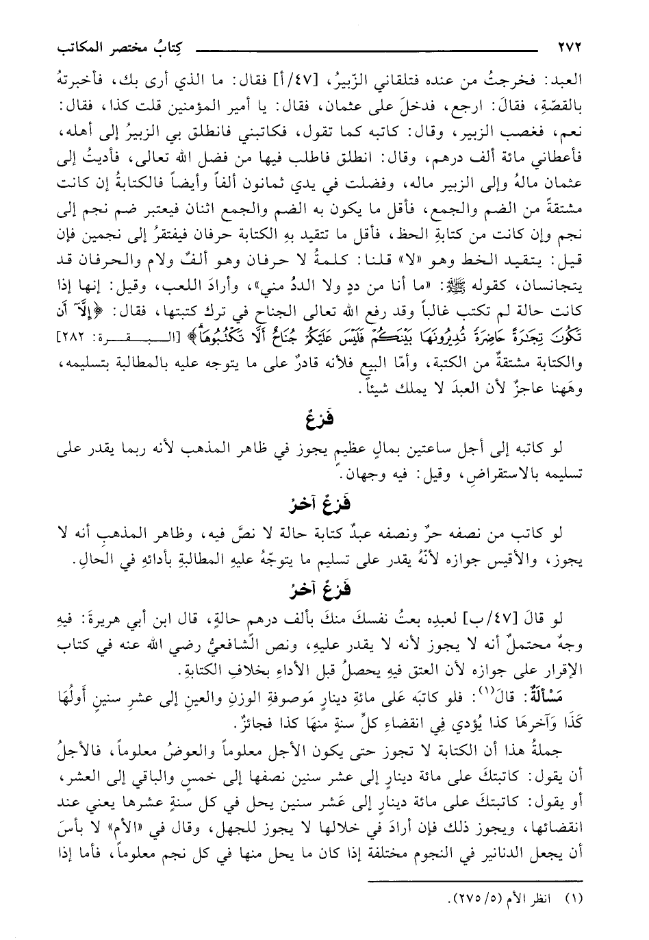 العبد: فخرجت من عنده فتلقاني الزبير، [47/ أ] فقال: ما الذي أرى بك، فأخبرته بالقصة، فقال: ارجع، فدخل على عثمان، فقال: يا أمير المؤمنين قلت كذا، فقال: نعم، فغضب الزبير، وقال: كاتبه كما تقول، فكاتبني فانطلق بي الزبير إلى أهله، فأعطاني مائة ألف درهم، وقال: انطلق فاطلب فيها من فضل الله تعالى، فأديت إلى عثمان ماله وإلى الزبير ماله، وفضلت في يدي ثمانون ألفًا وأيضًا فالكتابة إن كانت مشتقة من الضم والجمع، فأقل ما يكون به الضم والجمع اثنان فيعتبر ضم نجم إلى نجم وإن كانت من كتابة الحظ، فأقل ما تتقيد به الكتابة حرفان فيفتقر إلى نجمين فإن قيل: يتقيد الخط وهو «لا» قلنا: كلمة لا حرفان وهو ألف ولام والحرفان قد يتجانسان، كقوله - صلى الله عليه وسلم -: «ما أنا من دد ولا الدد مني»، وأراد اللعب، وقيل: إنها إذا كانت حالة لم تكتب غالبًا وقد رفع الله تعالى الجناح في ترك كتبتها، فقال: {إلاَّ أَن تَكُونَ تِجَارَةً حَاضِرَةً تُدِيرُونَهَا بَيْنَكُمْ فَلَيْسَ عَلَيْكُمْ جُنَاحٌ ألاَّ تَكْتُبُوهَا} [البقرة: 282] والكتابة مشتقة من الكتبة، وأما البيع فلأنه قادر على ما يتوجه عليه بالمطالبة بتسليمه، وههنا عاجز لأن العبد لا يملك شيئاً.