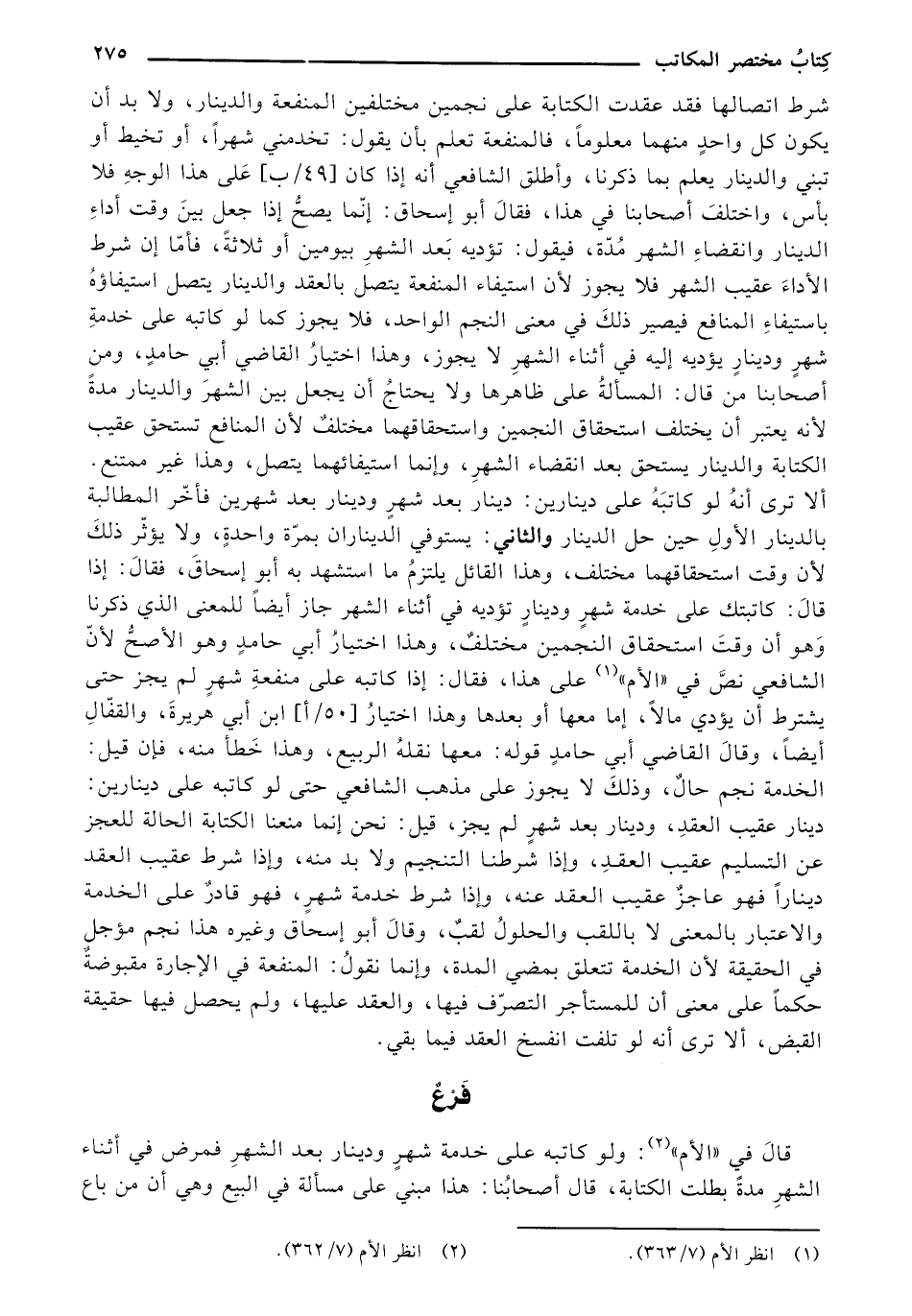 شرط اتصالها فقد عقدت الكتابة على نجمين مختلفين المنفعة والدينار، ولا بد أن يكون كل واحد منهما معلومًا، فالمنعفة تعلم بأن يقول: تخدمني شهرًا، أو تخيط أو تبني والدينار يعلم بما ذكرنا، وأطلق الشافعي أنه إذا كان [49/ ب] على هذا الوجه فلا بأس، واختلف أصحابنا في هذا، فقال أبو إسحاق: إنما يصح إذا جعل بين وقت أداء الدينار وانقضاء الشهر مدة، فيقول: تؤديه بعد الشهر بيومين أو ثلاثة، فأما إن شرط الأداء عقيب الشهر فلا يجوز لأن استيفاء المنفعة يتصل بالعقد والدينار يتصل استيفاؤه باستيفاء المنافع فيصير ذلك في معنى النجم الواحد، فلا يجوز كما لو كاتبه على خدمة شهر ودينار يؤديه إليه في أثناء الشهر لا يجوز، وهذا اختيار القاضي أبي حامد، ومن أصحابنا من قال: المسألة على ظاهرها ولا يحتاج أن يجعل بين الشهر والدينار مدة لأنه يعتبر أن يختلف استحقاق النجمين واستحقاقهما مختلف لأن المنافع تستحق عقيب الكتابة والدينار يستحق بعد انقضاء الشهر، وإنما استيفائهما يتصل، وهذا غير ممتنع. ألا ترى أنه لو كاتبه على دينارين: دينار بعد شهر ودينار بعد شهرين فأخر المطالبة بالدينار الأول حين حل الدينار والثاني: يستوفي الديناران بمرة واحدة، ولا يؤثر ذلك لأن وقت استحقاقهما مختلف، وهذا القائل يلتزم ما استشهد به أبو إسحاق، فقال: إذا قال: كاتبتك على خدمة شهر ودينار تؤديه في أثناء الشهر جاز أيضًا للمعنى الذي ذكرنا وهو أن وقت استحقاق النجمين مختلف، وهذا اختيار أبي حامد وهو الأصح لأن الشافعي نص في «الأم» على هذا، فقال: إذا كاتبه على منفعة شهر لم يجز حتى يشترط أن يؤدي مالا، إما معها أو بعدها وهذا اختيار [50/ أ] ابن أبي هريرة، والقفال أيضًا، وقال القاضي أبي حامد قوله: معها نقله الربيع، وهذا خطأ منه، فإن قيل: الخدمة نجم حال، وذلك لا يجوز على مذهب الشافعي حتى لو كاتبه على دينارين: دينار عقيب العقد، ودينار بعد شهر لم يجز، قيل: نحن إنما منعنا الكتابة الحالة للعجز عن التسليم عقيب العقد، وإذا شرطنا التنجيم ولا بد منه، وإذا شرط عقيب العقد دينارًا فهو عاجز عقيب العقد عنه، وإذا شرط خدمة شهر، فهو قادر على الخدمة والاعتبار بالمعنى لا باللقب والحلول لقب، وقال أبو إسحاق وغيره هذا نجم مؤجل في الحقيقة لأن الخدمة تتعلق بمضي المدة، وإنما نقول: المنفعة في الإجارة مقبوضة حكمًا على معنى أن للمستأجر التصرف فيها، والعقد عليها، ولم يحصل فيها حقيقة القبض، ألا ترى أنه لو تلفت انفسخ العقد فيما بقي.
