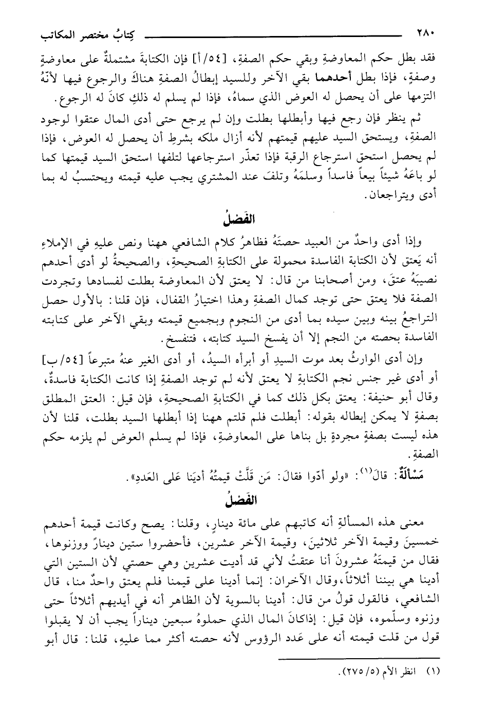 فقد بطل حكم المعاوضة وبقي حكم الصفة، [54/ أ] فإن الكتابة مشتملة على معاوضة وصفة، فإذا بطل أحدهما بقي الآخر وللسيد إبطال الصفة هناك والرجوع فيها لأنه التزمها على أن يحصل له العوض الذي سماه، فإذا لم يسلم له ذلك كان له الرجوع.