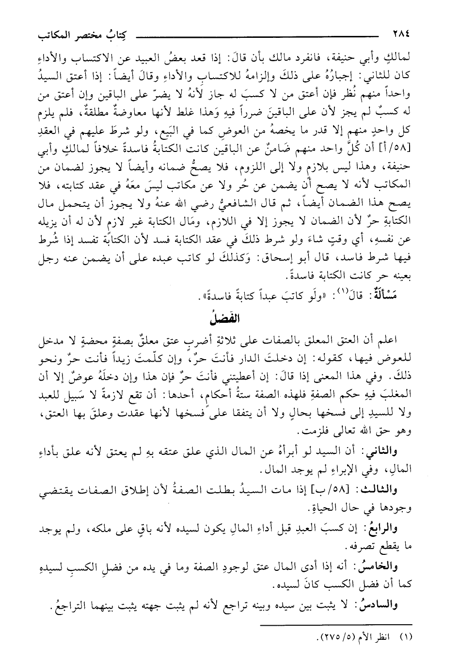 والخامس: أنه إذا أدى المال عتق لوجود الصفة وما في يده من فضل الكسب لسيده كما أن فضل الكسب كان لسيده.