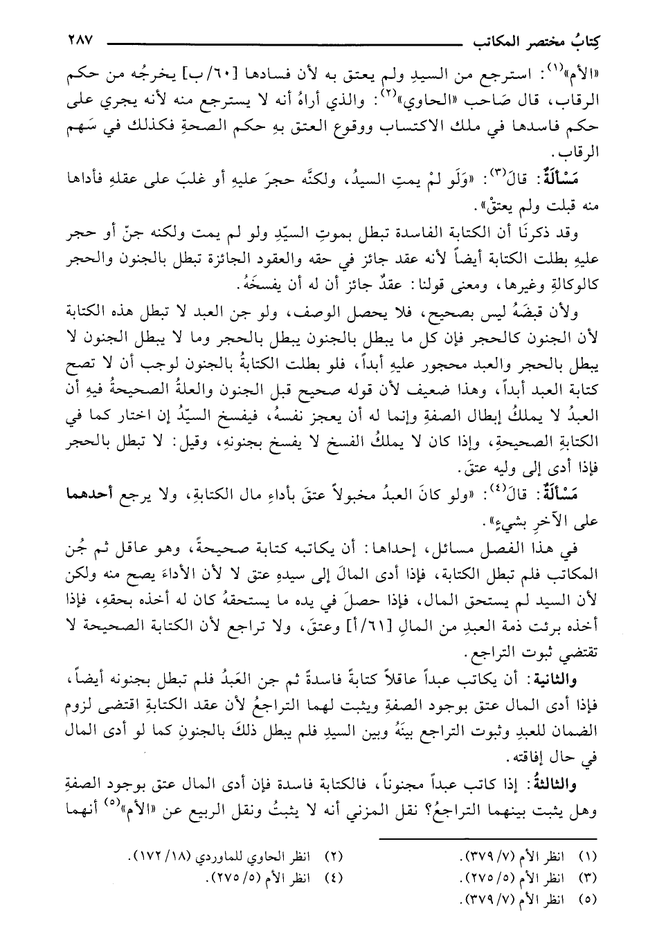 والثالثة: إذا كاتب عبدًا مجنونًا، فالكتابة فاسدة فإن أدى المال عتق بوجود الصفة وهل يثبت بينهما التراجع؟ نقل المزني أنه لا يثبت ونقل الربيع عن «الأم» أنهما