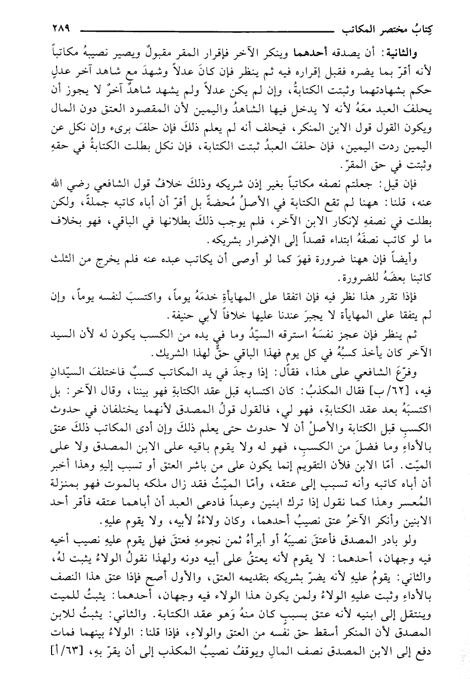 والثانية: أن يصدقه أحدهما وينكر الآخر فإقرار المقر مقبول ويصير نيبه مكاتبًا لأنه أقر بما يضره فقبل إقراره فيه ثم ينظر فإن كان عدلا وشهد مع شاهد آخر عدل حكم بشهادتهما وثبتت الكتابة، وإن لم يكن عدلا ولم يشهد شاهد آخر لا يجوز أن يحلف العبد معه لأنه لا يدخل فيها الشاهد واليمين لأن المقصود العتق دون المال ويكون القول قول الابن المنكر، فيحلف أنه لم يعلم ذلك فإن حلف برئ وإن نكل عن اليمين ردت اليمين، فإن حلف العبد ثبتت الكتابة، فإن نكل بطلت الكتابة في حقه وثبتت في حق المقر.