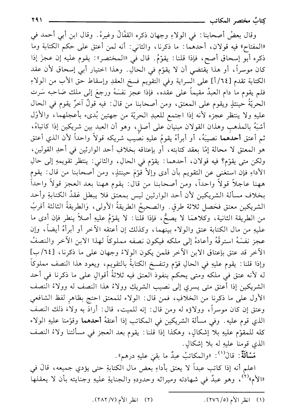 وقال بعض أصحابنا: في الولاء وجهان ذكره القفال وغيره. وقال ابن أبي أحمد في «المفتاح» فيه قولان، أحدهما: ما ذكرنا، والثاني: أنه لمن أعتق على حكم الكتابة وما ذكره أبو إسحاق أصح، فإذا قلنا: يقوم. قال في «المختصر»: يقوم عليه إن عجز إذا كان موسرًا، أو هذا يقتضي أن لا يقوم في الحال. وهذا اختيار أبي إسحاق لأن عقد الكتابة تقدم [64/ أ] على السراية وفي التقويم فسخ العقد وإسقاط حق الأب من الولاء فلم يقوم ما دام العبد مقيمًا على عقده، فإذا عجز نفسه ورجع إلى ملك صاحبه سرت الحرية حينئذ ويقوم على المعتق، ومن أصحابنا من قال: فيه قول آخر يقوم في الحال عليه ولا ينتظر عجزه لأنه إذا اجتمع للعبد الحرية من جهتين بدئ بأعجلهما، والأول أشبه بالمذهب وهذان القولان مبنيان على أصل، وهو أن العبد بين شريكين إذا كاتباه، ثم أعتق أحدهما نصيبه، أو أبرأه يقوم عليه نصيب شريكه قولا واحدًا لأن الذي أعتق هو المعتق لا محالة إما بعقد كتابته، أو بإعتاقه بخلاف أحد الوارثين في أحد القولين، ولكن متى يقوم؟ فيه قولان، أحدهما: يقوم في الحال، والثاني: ينتظر تقويمه إلى حال الأداء فإن استغنى عن التقويم بأن أدى وإلا قوم حينئذ، ومن أصحابنا من قال: يقوم ههنا عاجلاً قولاً واحدًا، ومن أصحابنا من قال: يقوم ههنا بعد العجز قولا واحدًا بخلاف مسألة الشريكين لن أحد الوارثين ليس بمعتق فلا يبطل عقد الكتابة وأحد الشريكين معتق فحصل ثلاثة طرق. والصحيح الطريقة الأولى، والطريقة الثالثة أقرب من الطريقة الثانية، وكلاهما لا يصح، فإذا قلنا: لا يقوم عليه أصلا ينطر فإن أدى ما عليه من مال الكتابة عتق والولاء بينهما، وكذلك إن أعتقه الآخر أو أبرأه أيضًا، وإن عجز نفسه استرقه وأعاده إلى ملكه فيكون نصفه مملوكًا لهذا الابن الآخر والنصف الآخر قد عتق بإعتاق الابن الآخر فلمن يكون الولاء وجهان على ما ذكرنا، [64/ ب] وإذا قلنا: يقوم عليه في الحال قوم وتنفسخ الكتابة بالتقويم، ويعود هذا النصف مملوكًا له لأنه عتق في ملكه ومتى يحكم بنفوذ العتق فيه ثلاثة أقوال على ما ذكرنا في أحد الشريكين إذا أعتق متى يسيري إلى نصيب الشريك وولاء هذا النصف له وولاء النصف الأول على ما ذكرنا من الخلاف، فمن قال: الولاء للمعتق احتج بظاهر لفظ الشافعي وعتق إن كان موسرًا، وولاؤه له ومن قال: إنه للميت، قال: أراد به ولاء ذلك النصف الذي قوم عليه. وفي مسألة الشريكين في المكاتب إذا أعتقه أحدهما وقومنا عليه الولاء كله للمقوم عليه بلا إشكال، وهكذا إذا قلنا: يقوم بعد العجز في مسألتنا ولاء النصف الذي قومنا عليه له بلا إشكال.