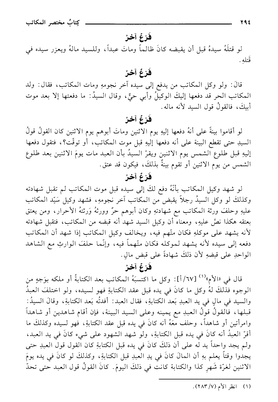 لو شهد وكيل المكاتب بأنه دفع لك إلى سيده قبل موت المكاتب لم تقبل شهادته وكذلك لو وكل السيد رجلا يقبض من المكاتب آخر نجومه، فشهد وكيل سيد المكاتب عليه وحلف ورثة المكاتب مع شهادته وكان أبوهم حر وورثه ورثته الأحرار، ومن يعتق بعتقه هكذا نص عليه، ومعناه أن وكيل السيد شهد أنه قبضه من المكاتب، فتقبل شهادته لأنه يشهد على موكله فكان متهم فيه، ويخالف وكيل المكاتب إذا شهد أن المكاتب دفعه إلى سيده لأنه يشهد لموكله فكان متهمًا فيه، وإنما حلف الوارث مع الشاهد الواحد على قبضه لأن ذلك شهادة على قبض مال.