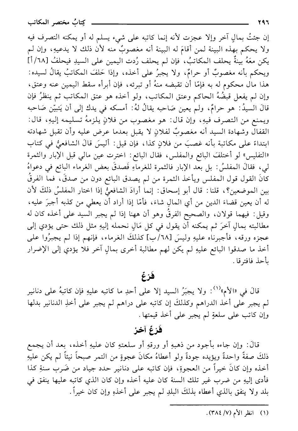 إن جئت بمال آخر وإلا عجزت لأنه إنما كاتبه على شيء يسلم له أو يمكنه التصرف فيه ولا يحمك بهذه البينة لمن أقام له البينة أنه مغصوب منه لأن ذلك لا يدعيه، وإن لم يكن معه بينة يحلف المكاتب، فإن لم يحلف ردت اليمين على السيد فيحلف [68/ أ] ويحكم بأنه مغصوب أو حرام، ولا يجبر على أخذه، وإذا حلف المكاتب يقال لسيده: هذا مال محكوم له به فإما أن تقبضه منه أوتبرئه، فإن أبرأه سقط اليمين عنه وعتق، وإن لم يفعل يقبضه الحاكم وعتق المكاتب، ولو أخذه هو عتق المكاتب ثم ينظر فإن قال السيد: هو حرام، ولم يعين صاحبه يقال له: أمسكه في يدك إلى أن يتبين صاحبه ويمنع من التصرف فيه، وإن قال: هو مغصوب من فلان يلزمه تسليمه إليه، قال: القفال وشهادة السيد أنه مغصوب لفلان لا يقبل بعدما عرض عليه وأن تقبل شهادته ابتداء على مكاتبة بأنه غصب من فلان كذا، فإن قيل: أليس قال الشافعي في كتاب «التفليس» لو اختلف البائع والمفلس، فقال البائع: اخترت عين مالي قبل الإبار والثمرة لي، فقال المفلس: بل بعد الإبار فالثمرة للغرماء فصدق بعض الغرماء البائع في دعواه كان القول قول المفلس ويأخذ الثمرة من لم يصدق البائع دون من صدق، فما الفرق بين الموضعين؟، قلنا: قال أبو إسحاق: إنما أراد الشافعي إذا اختار المفلس ذلك لأن له أن يعين قضاء الدين من أي المال شاء، فأما إذا أراد أن يعطي من كذبه أجبر عليه، وقيل: فيهما قولان، والصحيح الفرق وهو أن ههنا إذا لم يجبر السيد على أخذه كان له مطالبته بمال آخر ثم يمكنه أن يقول في كل مال نحمله إليه مثل ذلك حتى يؤدي إلى عجزه ورقه، فأجبرناه عليه وليس [68/ ب] كذلك الغرماء، فإنهم إذا لم يجبروا على أخذ ما صدقوا البائع عليه لم يكن لهم مطالبة أخرى بمال آخر فلا يؤدي إلى الإضرار بأخذ فافترقا.