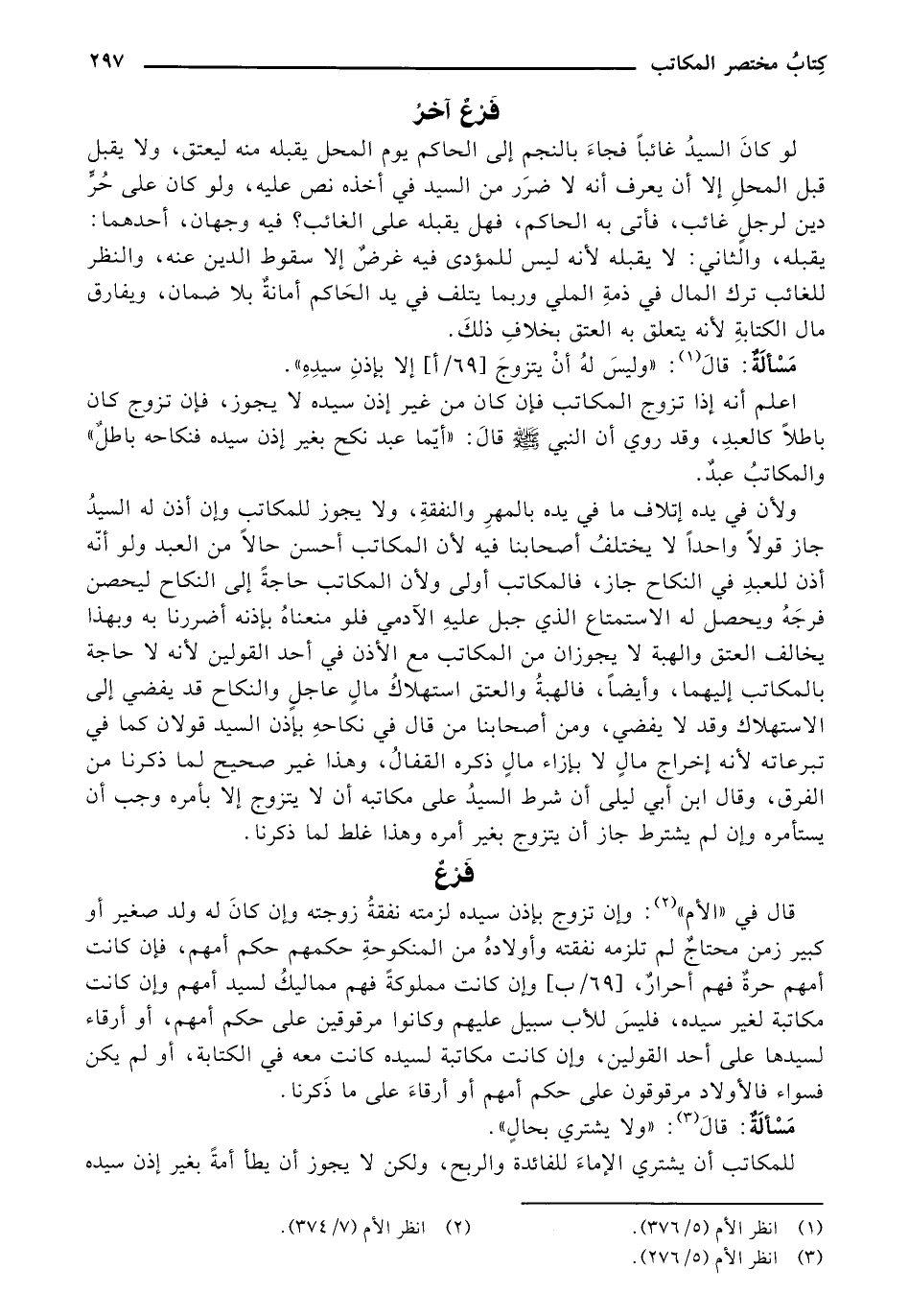 قال في «الأم»: وإن تزوج بإذن سيده لزمته نفقة زوجته وإن كان له ولد صغير أو كبير زمن محتاج لم تلزمه نفقته وأولاده من المنكوحة حكمهم حكم أمهم، فإن كانت أمهم حرة فهم أحرار، [69/ ب] وإن كانت مملوكة فهم مماليك لسيد أمهم وإن كانت مكاتبة لغير سيده، فليس للأب سبيل عليهم وكانوا مرقوقين على حكم أمهم، أو أرقاء لسيدها على أحد القولين، وإن كانت مكاتبة لسيده كانت معه في الكتابة، أو لم يكن فسواء فالأولاد مرقوقون على حكم أمهم أو أرقاء على ما ذكرنا.