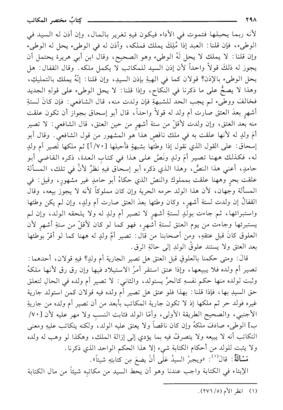 لأنه ربما يحبلها فتموت في الأداء فيكون فيه تغرير بالمال، وإن أذن له السيد في الوطئ، فإن قلنا: العبد إذا ملك يملك فملكه، وأذن له في الوطء يحل له الوطء وإن قلنا: لا يملك لا يحل له الوطء وهو الصحيح، وقال ابن أبي هريرة يحتمل أن يجوز له ذلك قولاً واحدًا لأن إذن السيد للمكاتب لا يكمل ملكه. وقال القفال: هل يحل الوطء بالإذن؟ قولان كما في الهبة بإذن السيد، وإن قلنا: إنه يملك بالتمليك، وهذا لا يصح على ما ذكرنا في النكاح، وإذا قلنا: لا يحل الوطء على قوله الجديد فخالف ووطء لم يجب الحد للشبهة فإن ولجت منه، قال الشافعي: فإن كان لستة أشهر بعد العتق صارت أم ولد له قولا واحدً، قال أبو إسحاق بجواز أن تكون علقت منه بعد العتق، وإن ولدت لأقل من ستة أشهر من حين العتق، قال الشافعي: لا تصير أم ولد له لأنها علقت به في ملك ناقص هذا هو المشهور من قول الشافعي. وقال أبو إسحاق: على القول الذي نقول إذا وطئها بشبهة فأحبلها [70/ أ] ثم ملكها تصير أم ولدٍ له، فكذلك ههنا تصير أم ولد ونص على هذا في كتاب العدة، ذكر القاضي أبو حامد، أغني هذا النص، وهذا الذي ذكره أبو إسحاق فيه نظر لأن في تلك، المسألة علقت بحر وههنا علقت بممولك والنص الذي حكاه أبو حامد غير مشهور، وقيل في المسألة وجهان، لأن هذا الولد حرمه الحرية وإن كان مملوكًا لأنه لا يجوز بيعه، وقال القفال إن ولدت لستة أشهر، وكان وطئها بعد العتق صارت أم ولد، وإن لم يكن وطئنا واستبرائها، ثم جاءت بولد لستة أشهر لا تصير أم ولد له ولا يلحقه الولد، وإن لم يستبرئها وجاءت من يوم العتق لستة أشهر، فهو كما لو كان لأقل من ستة أشهر لأن العلوق كان قبل عتقه، ومن أصحابنا من قال: تصير أم ولد له ههنا كما لو أقر بوطئها بعد العتق ولا يستند علوق الولد إلى حالة الرق.