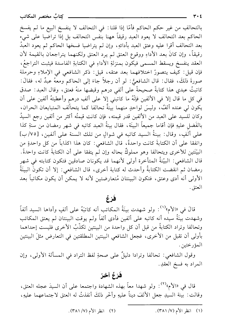 بالتحالف من غير حكم الحاكم فأما إذا قلنا: في التحالف لا ينفسخ البيع ما لم يفسخ الحاكم بعد التحالف لا يعود العبد رقيقًا ههنا بنفس التحالف بل إذا تراضيا على شيء بعد التحالف أقرا عليه وعتق العبد بأدائه، وإن لم يتراضيا فسخها الحاكم ثم يعود العبد رقيقًا، وإن كان بعد الأداء ووقوع العتق لم يرد العتق ولكنهما يتراجعان بالقيمة لأن العقد ينفسخ ويسقط المسمى فيكون بمنزلة الأداء في الكتابة الفاسدة فيثبت التراجع، فإن قيل: كيف يتصور اختلافهما بعد عتقه، قيل: ذكر الشافعي في الإملاء وحرملة صورة ذلك، فقال: قال الشافعي: لو أن رجلا جاء إلى الحاكم ومعه عبد له، فقال: كاتبت عبدي هذا كتابة صحيحة على ألفي درهم وقبضها منه فعتق، وقال العبد: صدق في كل ما قال إلا في الألفين فإنه ما كاتبني إلا على ألف درهم وأعطيته ألفين على أن يكون لي عنده ألف، وليس لواحد منهما بينة تحالفا كما يتحالف المتبايعان الحران، وكان للسيد على العبد من الألفين قدر قيمته، فإن كانت قيمته أكثر من ألفين رجع السيد بالفضل عليه فإن أقاما جميعًا البينة، فقال بينة العبد كاتبه في شهر رمضان من سنة كذا على ألف، وقال: بينة السيد كاتبه في شوال من تلك السنة على ألفين، [75/ ب] واتفقا على أن الكتابة كانت واحدة، قال الشافعي: كان هذا كذابا من كل واحدة من البينتين للأخرى ويتحالفا وهو مملوك بحاله وإن لم يتفقا على أن الكتابة كانت واحدة. قال الشافعي: البينة المتأخرة أولى لأنهما قد يكونان صادقين فتكون كتابته في شهر رمضان ثم انقضت الكتابة وأحدث له كتابة أخرى، قال الشافعي: إلا أن تكون البينة الأولى أنه أدى وعتق، فتكون البينتان متعارضتين لأنه لا يمكن أن يكون مكاتبًا بعد العتق.