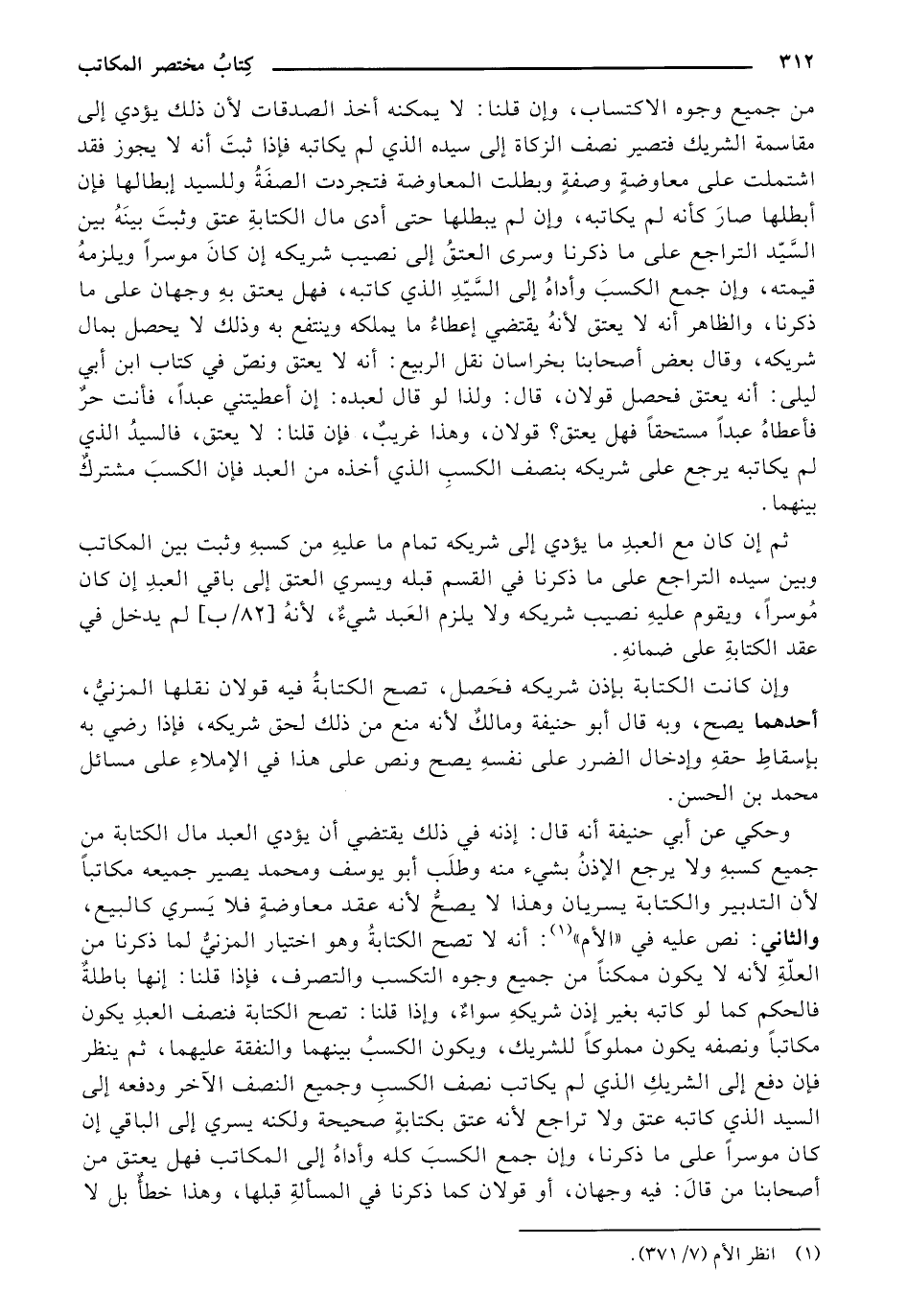 ثم إن كان مع العبد ما يؤدي إلى شريكه تمام ما عليه من كسبه وثبت بين المكاتب وبين سيده التراجع على ما ذكرنا في القسم قبله ويسري العتق إلى باقي العبد إن كان موسرًا، ويقوم عليه نصيب شريكه ولا يلزم العبد شيء، لأنه [82/ ب] لم يدخل في عقد الكتابة على ضمانه.
