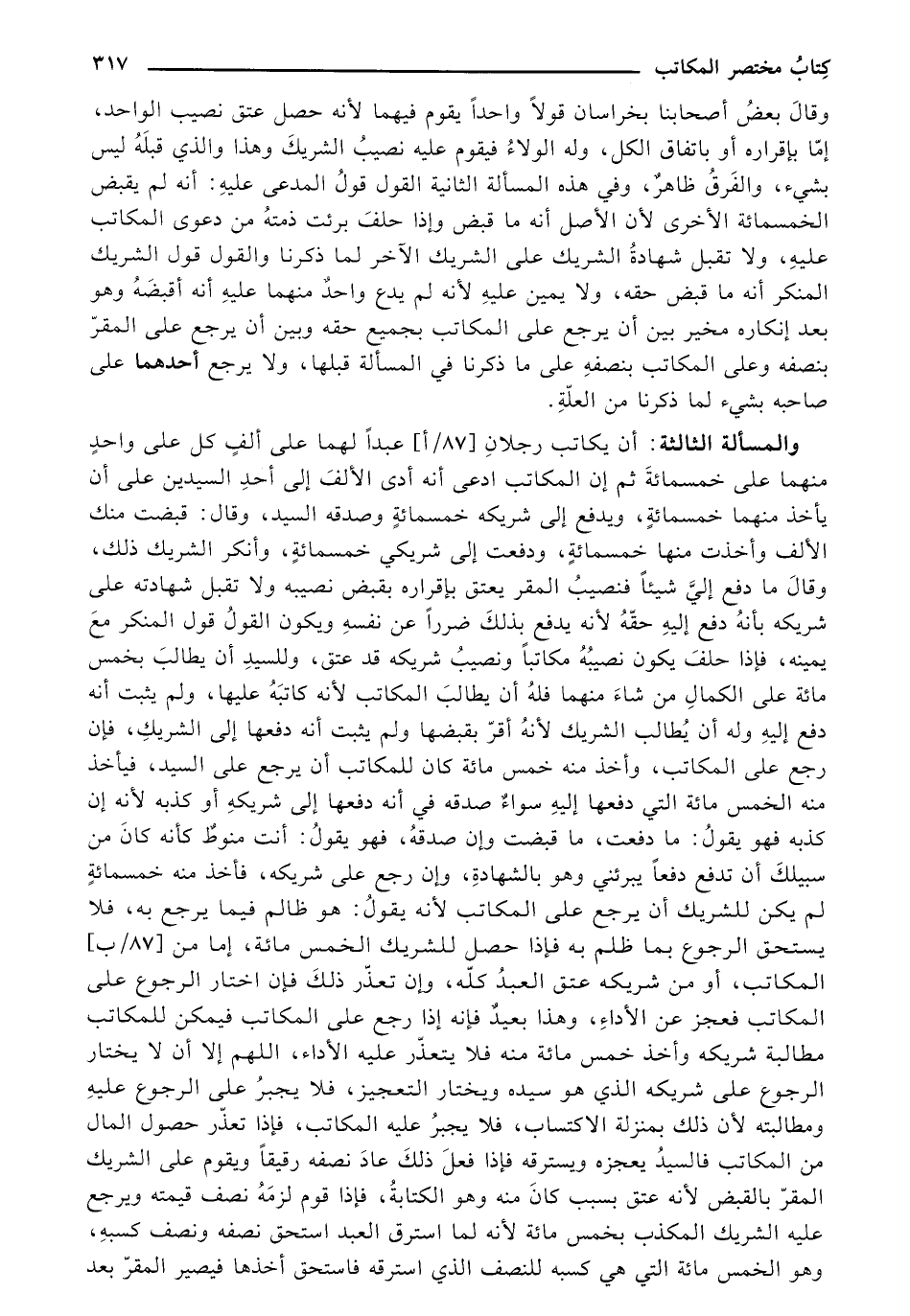 والمسألة الثالثة: أن يكاتب رجلان [87/ أ] عبدًا لهما على ألف كل على واحد منهما على خمسمائة ثم إن المكاتب ادعى أنه أدى الألف إلى أحد السيدين على أن يأخذ منهما خمسمائة، ويدفع إلى شريكه خمسمائة وصدقه السيد، وقال قبضت منك الألف وأخذت منها خمسمائة، ودفعت إلى شريكي خمسمائة، وأنكر الشريك ذلك، وقال ما دفع إلي شيئًا فنصيب المقر يعتق بإقراره بقبض نصيبه ولا تقبل شهادته على شريكه بأنه دفع إليه حقه لأنه يدفع بذلك ضررًا عن نفسه ويكون القول قول المنكر مع يمينه، فإذا حلف يكون نصيبه مكاتبًا ونصيب شريكه قد عتق، وللسيد أن يطالب بخمس مائة على الكمال من شاء منهما فله أن يطالب المكاتب لأنه كاتبه عليها، ولم يثبت أنه دفع إليه وله أن يطالب الشريك لأنه أقر بقبضها ولم يثبت أنه دفعها إلى الشريك، فإن رجع على المكاتب، وأخذ منه خمس مائة كان للمكاتب أن يرجع على السيد، فيأخذ منه الخمس مائة التي دفعها إليه سواء صدقه في أنه دفعها إلى شريكه أو كذبه لأنه إن كذبه فهو يقول: ما دفعت، ما قبضت وإن صدقه، فهو يقول: أنت منوط كأنه كان من سبيلك أن تدفع دفعًا يبرئني وهو بالشهادة، وإن رجع على شريكه، فأخذ منه خمسمائة لم يكن للشريك أن يرجع على المكاتب لأنه يقول: هو ظالم فيما يرجع به، فلا يستحق الرجوع بما ظلم به فإذا حصل للشريك الخمس مائة، إما من [87/ ب] المكاتب، أو من شريكه عتق العبد كله، وإن تعذر ذلك فإن اختار الرجوع على المكاتب فعجز عن الأداء، وهذا بعيد فإنه إذا رجع على المكاتب فيمكن للمكاتب مطالبة شريكه وأخذ خمس مائة منه فلا يتعذر عليه الأداء، اللهم إلا أن لا يختار الرجوع على شريكه الذي هو سيده ويختار التعجيز، فلا يجبر على الرجوع عليه ومطالبته لأن ذلك بمنزلة الاكتساب، فلا يجبر عليه المكاتب، فإذا تعذر حصول المال من المكاتب فالسيد يعجزه ويسترقه فإذا فعل ذلك عاد نصفه رقيقًا ويقوم على الشريك المقر بالقبض لأنه عتق بسبب كان منه وهو الكتابة، فإذا قوم لزمه نصف قيمته ويرجع عليه الشريك المكذب بخمس مائة لأنه لما استقر العبد استحق نصفه ونصف كسبه، وهو الخمس مائة التي هي كسبه للنصف الذي استرقه فاستحق أخذها فيصير المقر بعد