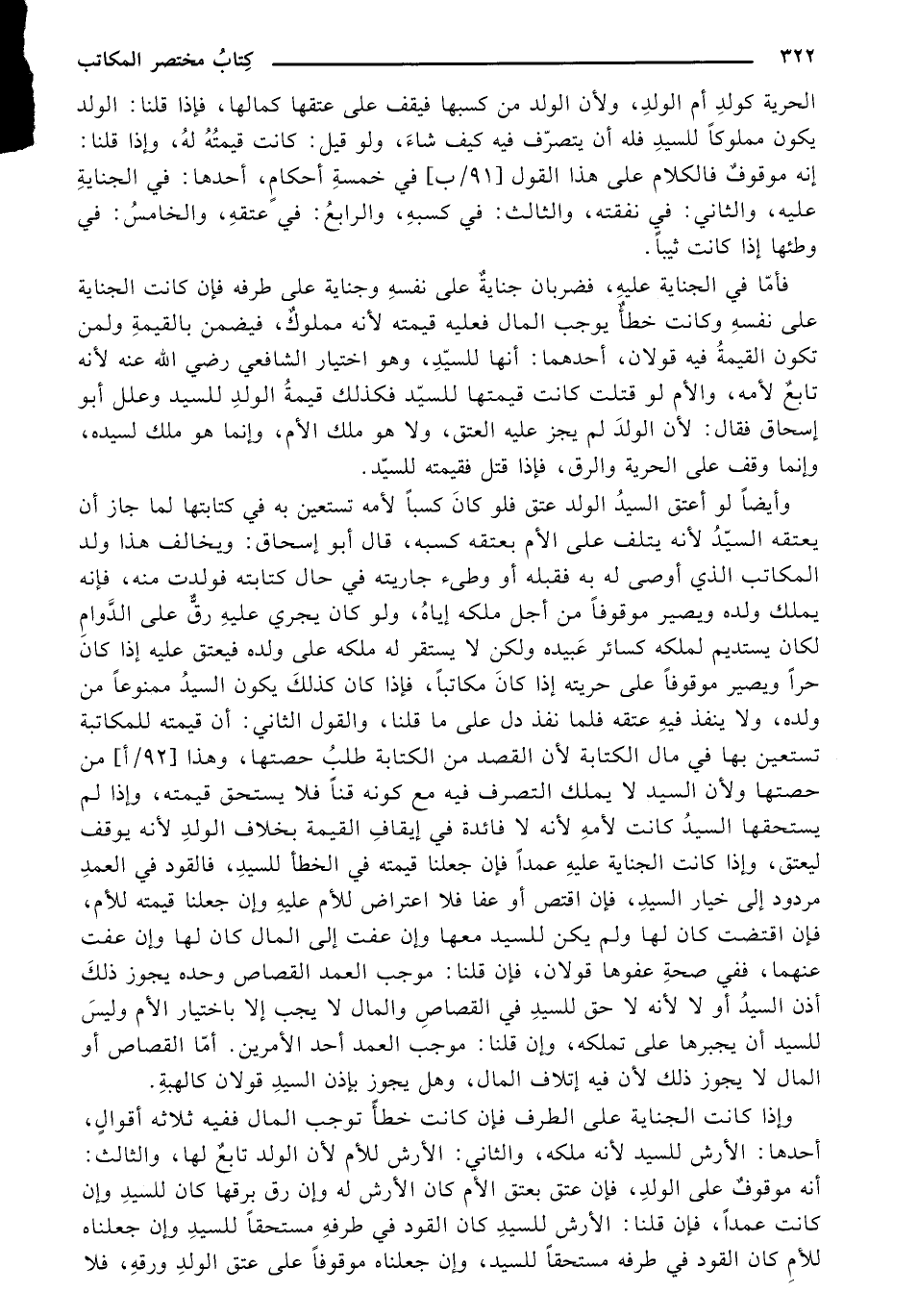 الحرية كولد أم الولد، ولأن الولد من كسبها فيقف على عتقها كمالها، فإذا قلنا: الولد يكون مملوكًا للسيد فله أن يتصرف فيه كيف شاء، ولو قيل: كانت قيمته له، وإذا قلنا: إنه موقوف فالكلام على هذا القول [91/ ب] في خمسة أحكام، أحدها: في الجناية عليه، والثاني: في نفقته، والثالث: في كسبه، والرابع: في عتقه، والخامس: في وطئها إذا كانت ثيبًا.