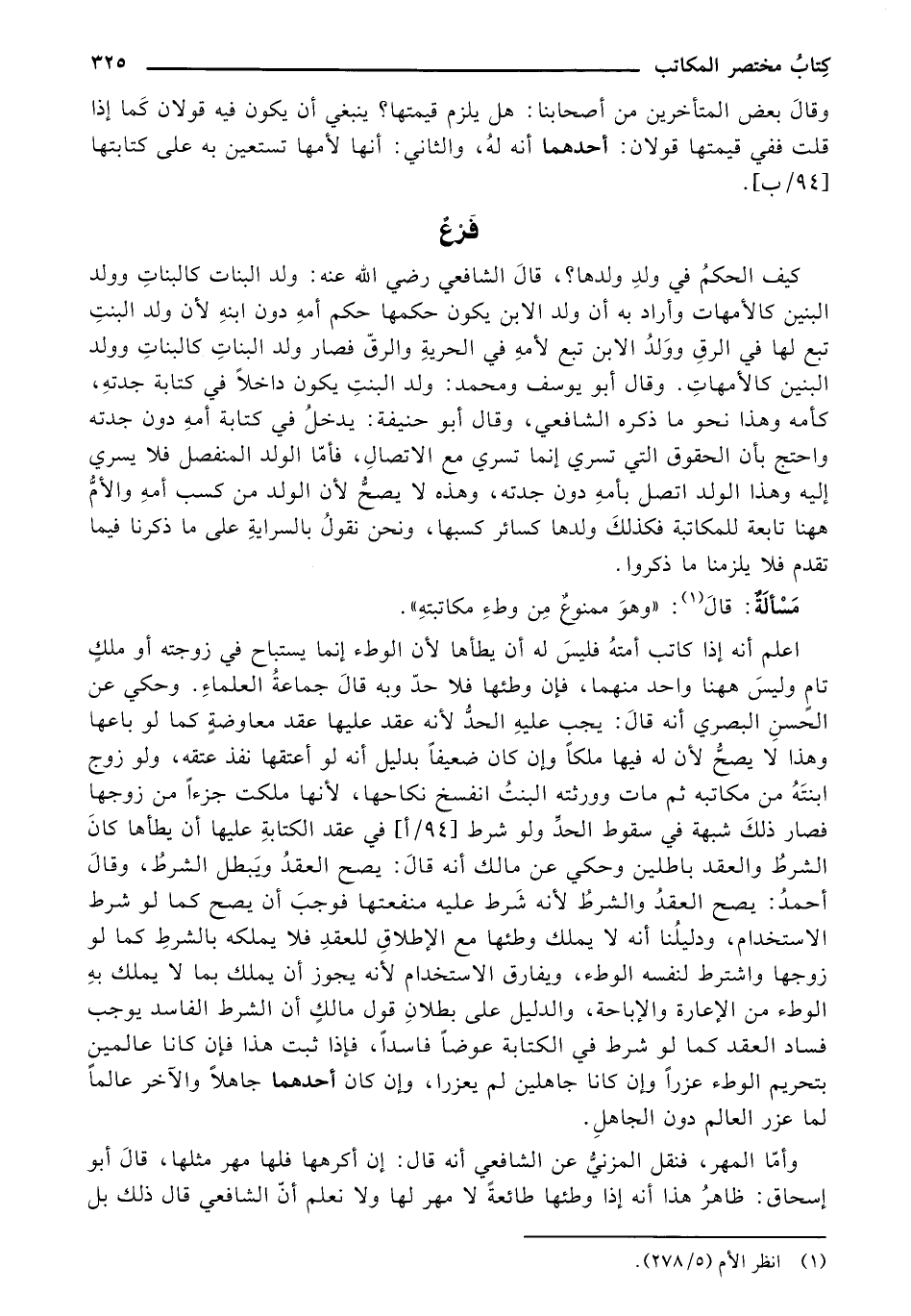 وقال بعض المتأخرين من أصحابنا: هل يلزم قيمتها؟ ينبغي أن يكون فيه قولان كما إذا قلت ففي قيمتها قولان: أحدهما أنه له، والثاني: أنها لأمها تستعين به على كتابتها [94/ ب].