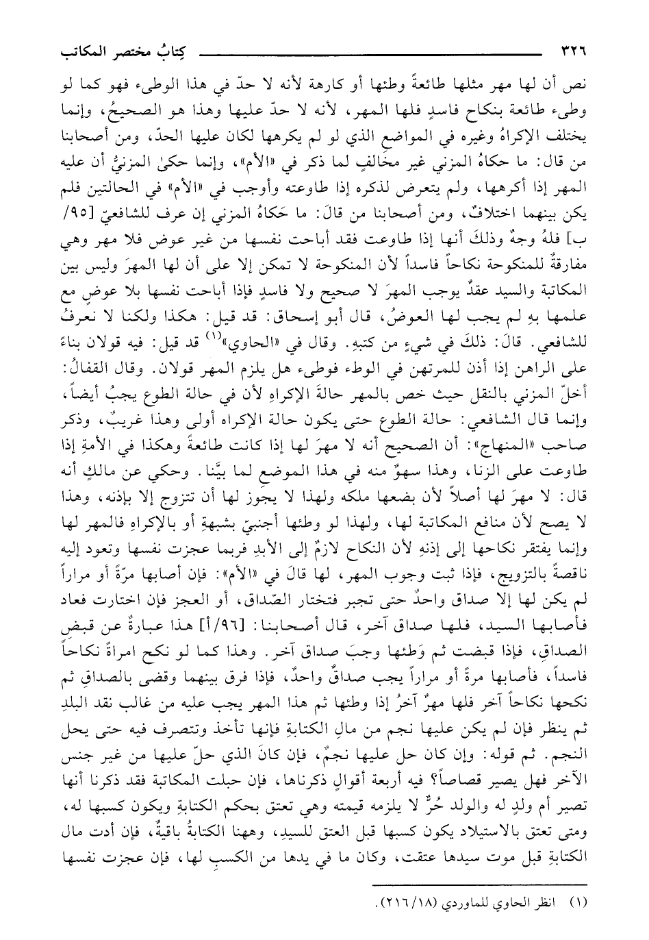 نص أن لها مهر مثلها طائعة وطئها أو كارهة لأنه لا حد في هذا الوطئ فهو كما لو وطئ طائعة بنكاح فاسد فلها المهر، لأنه لا حد عليها وهذا هو الصحيح، وإنما يختلف الإكراه وغيره في المواضع الذي لو لم يكرهها لكان عليها الحد، ومن أصحابنا من قال: إذا أكرهها، ولم يتعرض لذكره إذا طاوعته وأوجب في «الأم» في الحالتين فلم يكن بينهما اختلاف، ومن أصحابنا من قال: ما حكاه المزني إن عرف للشافعي [95/ ب] فله وجه وذلك أنها إذا طاوعت فقد أباحت نفسها من غير عوض فلا مهر وهي مفارقة للمنكوحة نكاحًا فاسدًا لأنه المنكوحة لا تمكن إلا على أن لها المهر وليس بين المكاتبة والسيد عقد يوجب المهر لا صحيح ولا فاسد فإذا أباحت نفسها بلا عوض مع علمها به لم يجب لها العوض، قال أبو إسحاق: قد قيل: هكذا ولكنا لا نعرف للشافعي. قال: ذلك في شيء من كتبه. وقال في «الحاوي» قد قيل: فيه قولان بناء على الراهن إذا أذن للمرتهن في الوطء فوطئ هل يلزم المهر قولان. وقال القفال: أخل المزني بالنقل حيث خص بالمهر حالة الإكراه لأن في حالة الطوع يجب أيضًا، وإنما قال الشافعي: حالة الطوع حتى يكون حالة الإكراه أولى وهذا غريب، وذكر صاحب «المنهاج»: أن الصحيح أنه لا مهر لها إذا كانت طائعة وهكذا في الأمة إذا طاوعت على الزنا، وهذا سهو منه في هذا الموضع لما بينا. وحكي عن مالك أنه قال: لا مهر لها أصلا لأن بضعها ملكه ولهذا لا يجوز له أن تتزوج إلا بإذنه، وهذا لا يصح لأن منافع المكاتبة لها، ولهذا لو وطئها أجنبي بشبهة أو بالإكراه فالمهر لها وإنما يفتقر نكاحها إلى إذنه لأن النكاح لازم إلى الأبد فربما عجزن نفسها وتعود إليه ناقصة بالتزويج، فإذا ثبت وجود المهر، لها قال في «الأم»: فإن أصابها مرة أو مرارًا لم يكن لها إلا صداق واحد حتى تجبر فتختار الصداق، أو العجز فإن اختارت فعاد فأصابها السيد، فلها صداق آخر، قال أصحابنا: [96/ أ] هذا عبارة عن قبض الصداق، وفإذا قبضت ثم وطئها وجب صداق آخر. وهذا كما لو نكح امرأة نكاحًا فاسدًا، فأصابها رة أو مرارًا يجب صداق واحدًا، فإذا فرق بينهما وقضى بالصداق ثم نكحها نكاحًا آخر فلها مهر آخر إذا وطئها ثم هذا المهر يجب عليه من غالب نقد البلد ثم ينظر فإن لم يكن عليها نجم من مال الكتابة فإنها تأخذ وتتصرف فيه حتى يحل النجم. ثم قوله: وإن كان حل عليها نجم، فإن كان الذي حل عليها من غير جنس الآخر فهل يصير قصاصًا؟ فيه أربعة أقوال ذكرناها، فإن حبلت المكاتبة فقد ذكرنا أنها تصير أم ولد له والولد حر لا يلزمه قيمته وهي تعتق بحكم الكتابة ويكون كسبها له، ومتى تعتق بالاستيلاد يكون كسبها قبل العتق للسيد، وههنا الكتابة باقية، فإن أدت مال الكتابة قبل موت سيدها عتقت، وكان ما في يدها من الكسب لها، فإن عجزت نفسها