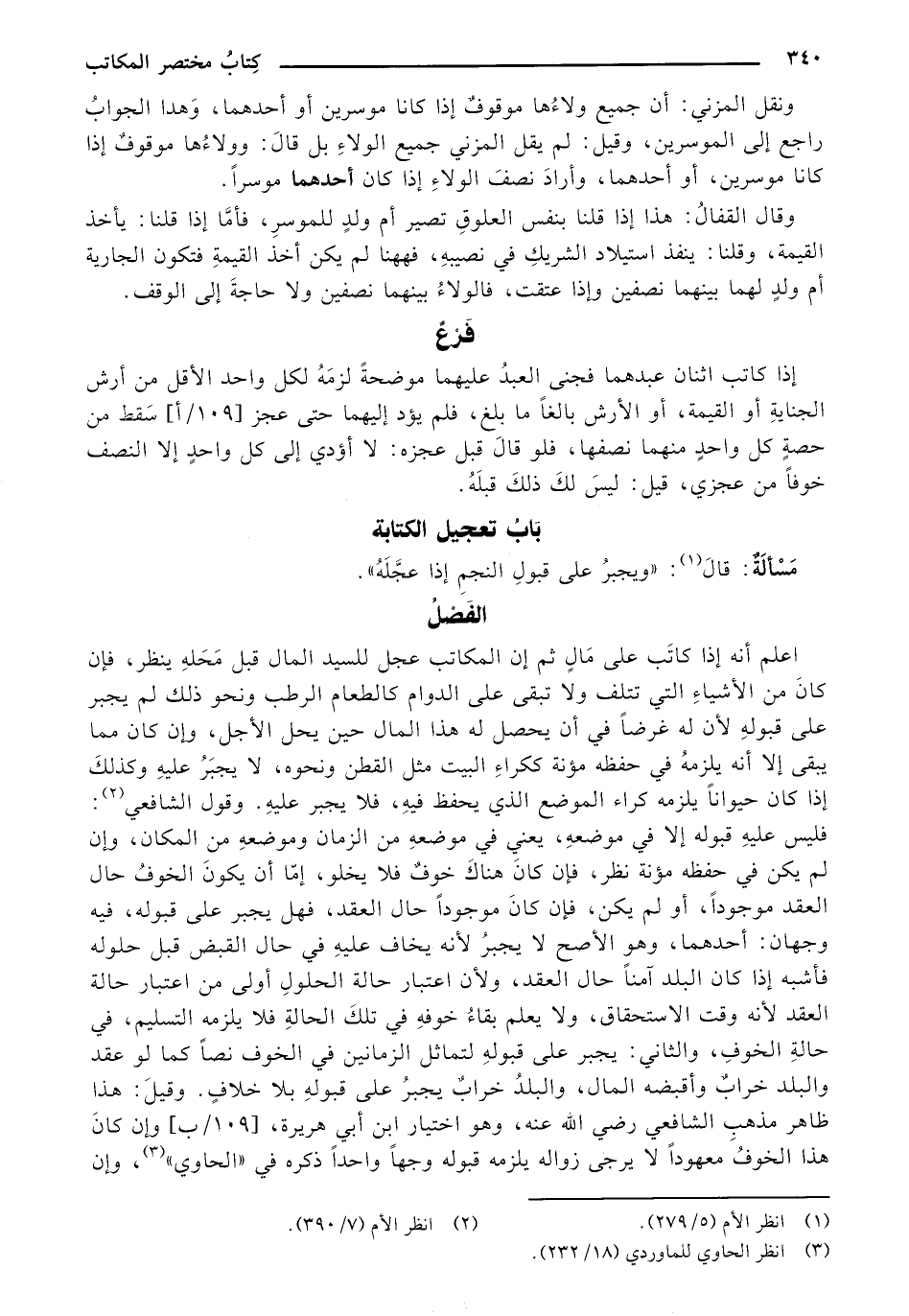 اعلم أنه إذا كاتب على مال ثم إن المكاتب عجل للسيد المال قبل محله ينظر، فإن كان من الأشياء التي تتلف ولا تبقى على الدوام كالطعام الرطب ونحو ذلك لم يجبر على قبوله لأن له غرضًا في أن يحصل له هذا المال حين يحل الأجل، وإن كان مما يبقى إلا أنه يلزمه في حفظه مؤنة ككراء البيت مثل القطن ونحوه، لا يجبر عليه وكذلك إذا كان حيوانًا يلزمه كراء الموضع الذي يحفظ فيه، فلا يجبر عليه. وقول الشافعي: فليس عليه قبوله إلا في موضعه، يعني في موضعه من الزمان وموضعه من المكان، وإن لم يكن في حفظه مؤنة نظر، فإن كان هناك خوف فلا يخلو، إما أن يكون الخوف حال العقد موجودًا، أو لم يكن، فإن كان موجودًا حال العقد، فهل يجبر على قبوله، فيه وجهان: أحدهما، وهو الأصح لا يجبر لأنه خاف عليه في حال القبض قبل حلوله فأشبه إذا كان البلد آمنا حال العقد، ولأن اعتبار حالة الحلول أولى من اعتبار حالة العقد لأنه وقت الاستحقاق، ولا يعلم بقاء خوفه في تلك الحالة فلا يلزمه التسليم، في حالة الخوف، والثاني: يجبر على قبوله لتماثل الزمانين في الخوف نصًا كما لو عقد والبلد خراب وأقبضه المال، والبلد خراب يجبر على قبوله بلا خلاف. وقيل: هذا ظاهر مذهب الشافعي رر، وهو اختيار ابن أبي هريرة، [109/ ب] وإن كان هذا الخوف معهودًا لا يرجى زواله يلزمه قبوله وجهًا واحدًا ذكره في «الحاوي»، وإن