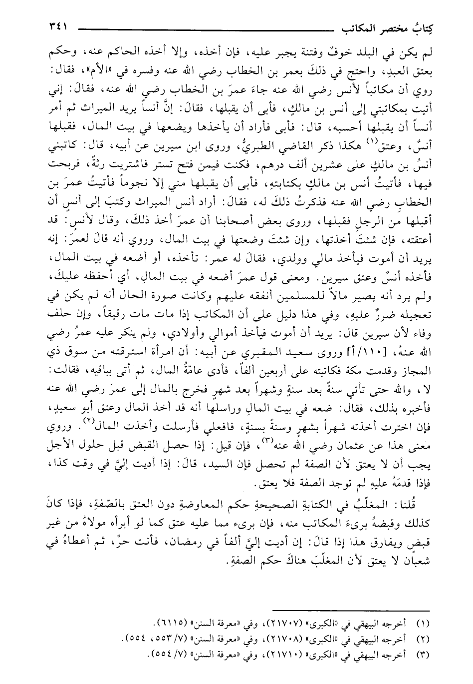لم يكن في البلد خوف وفتنة يجبر عليه، فإن أخذه، وإلا أخذه الحاكم عنه، وحكم بعتق العبد، واحتج في ذلك بعمر بن الخطاب رضي الله عنه وفسره في «الأم»، فقال: روي أن مكاتبًا لأنس رضي الله عنه جاء عمر بن الخطاب رضي الله عنه، فقال: إني أتيت بمكاتبتي إلى أنس بن مالك، فأبى أن يقبلها، فقال: إن أنسًا يريد الميراث ثم أمر أنسًا أن يقبلها أحسبه، قال: فأبى فأراد أن يأخذها ويضعها في بيت المال، فقبلها أنس، وعتق هكذا ذكر القاضي الطبري، وروى ابن سيرين عن أبيه، قال: كاتبني أنس بن مالك على عشرين ألف درهم، فكنت فيمن فتح تستر فاشتريت رثة، فربحت فيها، فأتيت أنس بن مالك بكتابته، فأبى أن يقبلها مني إلا نجومًا فأتيت عمر بن الخطاب رضي الله عنه فذكرت ذلك له، فقال: أراد أنس الميراث وكتب إلى أنس أن أقبلها من الرجل فقبلها، وروى بعض أصحابنا أن عمر أخذ ذلك، وقال لأنس: قد أعتقته، فإن شئت أخذتها، وإن شئت وضعتها في بيت المال، وروي أنه قال لعمر: إنه يريد أن أموت فيأخذ مالي وولدي، فقال له عمر: تأخذه، أو أضعه في بيت المال، فأخذه أنس وعتق سيرين. ومعنى قول عمر أضعه في بيت المال، أي أحفظه عليك، ولم يرد أنه يصير مالا للمسلمين أنفقه عليهم وكانت صورة الحال أنه لم يكن في تعجيله ضرر عليه، وفي هذا دليل على أن المكاتب إذا مات مات رقيقًا، وإن حلف وفاء لأن سيرين قال: يريد أن أموت فيأخذ أموالي وأولادي، ولم ينكر عليه عمر رضي الله عنه، [110/ أ] وروى سعيد المقبري عن أبيه: أن امرأة استرقته من سوق ذي المجاز وقدمت مكة فكاتبته على أربعين ألفًا، فأدى عامة المال، ثم أتى بباقيه، فقالت: لا، والله حتى تأتي سنة بعد سنة وشهرًا بعد شهر فخرج بالمال إلى عمر رضي الله عنه فأخبره بذلك، فقال: ضعه في بيت المال وراسلها أنه قد أخذ المال وعتق أبو سعيد، فإن اخترت أخذته شهرًا بشهر وسنة بسنة، فافعلي فأرسلت وأخذت المال. وروي معنى هذا عن عثمان رضي الله عنه، فإن قيل: إذا حصل القبض قبل حلول الأجل يجب أن لا يعتق لأن الصفة لم تحصل فإن السيد، قال: إذا أديت إلي في وقت كذا، فإذا قدمه عليه لم توجد الصفة فلا يعتق.