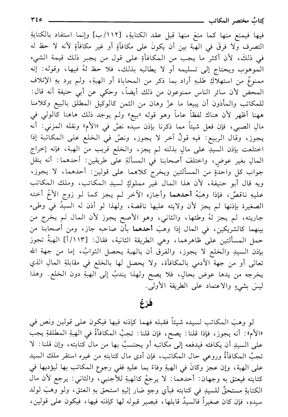 فيها فيمنع منها كما منع منها قبل عقد الكتابة، [112/ ب] وإنما استفاد بالكتابة التصرف ولا فرق في الهبة بين أن يكون على مكافأة أو غير مكافأة لأنه لاحظ له في ذلك، لأن أكثر ما يجب من المكافأة على قول من يجبر ذلك قيمة الشيء الموهوب ويحتاج إلى تسليمه أو لا يطالبه بذلك، فلا حظ له فيها، وقوله: إنه ممنوع من استهلاك طلبه أراد بما ذكر من المحاباة أو الهبة، ولم يرد به الإتلاف المحض لأن سائر الناس ممنوعون من ذلك أيضًا، وحكي عن أبي حنيفة أنه قال: للمكاتب والمأذون أن يبيعها ما عز وهان من الثمن كالوكيل المطلق بالبيع وكلامنا ههنا أظهر لأن هناك لفظًا عامًا وهو قوله «بيع» ولم يوجد ذلك هاهنا كالولي في مال الصبي، فإن فعل شيئا مما ذكرنا بإذن سيده نص في «الأم» ونقله المزني: أنه يجوز، وقال الربيع: فيه قول آخر لا يجوز، ونص في الخلع على المكاتبة إذا اختلعت بإذن السيد على مال بذلته لم يجز، والخلع قريب من الهبة، فإنه إخراج المال بغير عوض، واختلف أصحابنا في المسألة على طريقين: أحدهما: أنه ينقل جواب كل واحد من المسألتين ويخرج كلاهما على قولين: أحدهما، ولا يجوز، وبه قال أبو حنيفة، لأن هذا المال غير مملوك لسيد المكاتب، وملك المكاتب عليه ناقص، فإذا وهبه أحدهما وأجازه الآخر لم يجز كما لو زوج الأخ أخته الصغيرة بإذنها لم يجز لأن ولايته عليها ناقصة، ولهذا لو أذن له السيد في وطئ جاريته، لم يجز له وطئها، والثاني، وهو الأصح يجوز لأن المال لم يخرج من بينهما كالشريكين، في المال إذا وهب أحدهما بأن صاحبه جاز، ومن أصحابنا من حمل المسألتين على ظاهرهما، وهي الطريقة الثانية، فقال: [113/ أ] الهبة تجوز بإذن السيد والخلع لا يجوز، والفرق أن بالهبة يحصل الثواب، إما من جهة الله تعالى أو من جهة الآدمي بالمكافأة، ولا يحصل لها بالخلع في مقابلة المال الذي يخرجه من يدها عوض بحال، فلا يصح ولهذا يندب إلى الهبة دون الخلع. وهذا ليس بشيء والاعتماد على الطريقة الأولى.