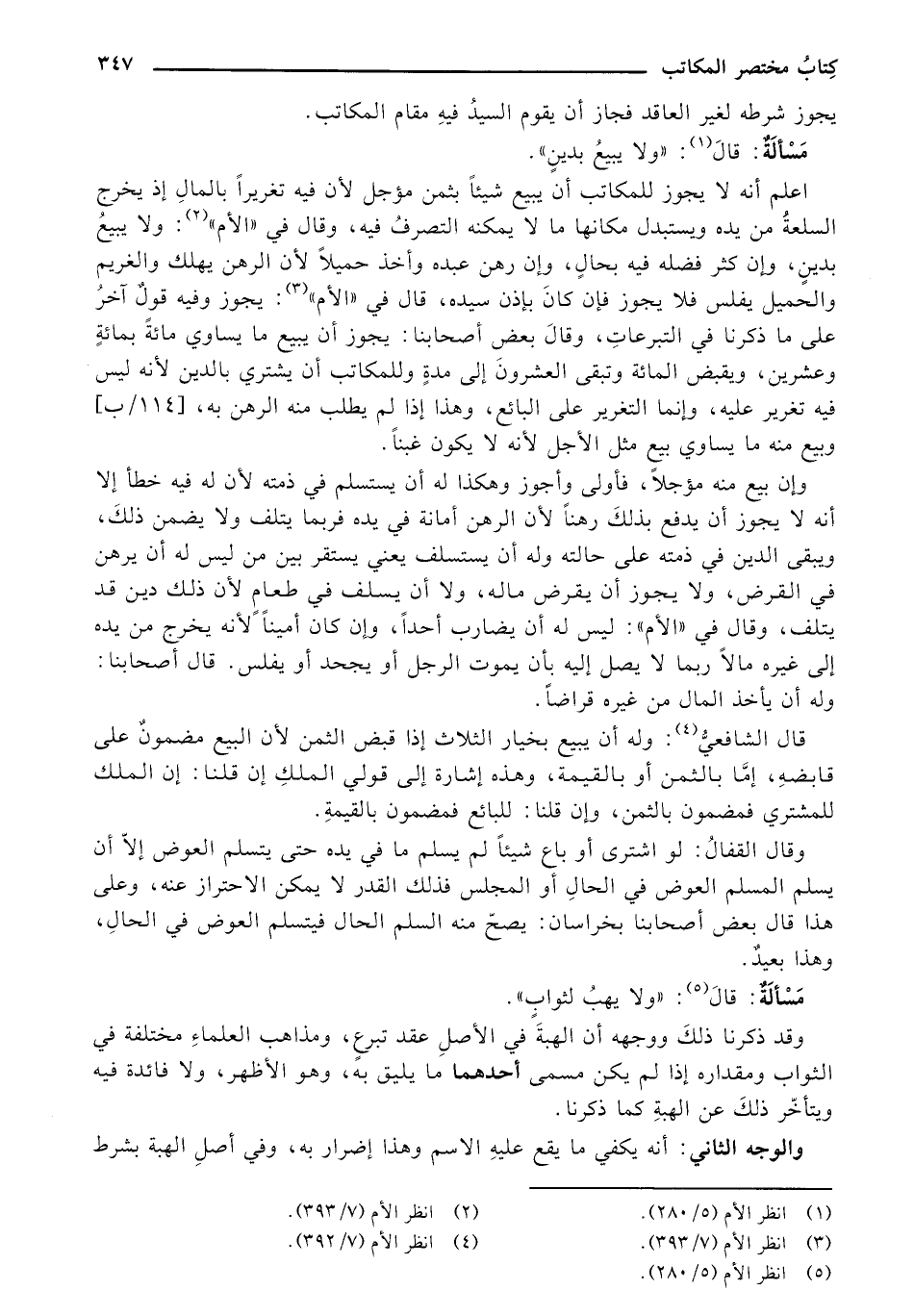 اعلم أنه لا يجوز للمكاتب أن يبيع شيئًا بثمن مؤجل لأنه فيه تغريرًا بالمال إذا يخرج السلعة من يده ويستبدل مكانها ما لا يمكنه التصرف فيه، وقال في «الأم»: ولا يبيع بدين، وإن كثر فضله فيه بحال، وإن رهن عبده وأخذ حميلا لأن الرهن يهلك والغريم والحميل يفلس فلا يجوز فإن كان بإذن سيده، قال في «الأم»: يجوز وفيه قول آخر على ما ذكرنا في التبرعات، وقال بعض أصحابنا: يجوز أن يبيع ما يساوي مائة بمائة وعشرين، ويقبض المائة وتبقى العشرون إلى مدة وللمكاتب أن يشتري بالدين لأنه ليس فيه تغرير عليه، ,إنما التغرير على البائع، وهذا إذا لم يطلب منه الرهن به، [114/ ب] وبيع منه ما يساوي بيع مثل الأجل لأنه لا يكون غبنًا.