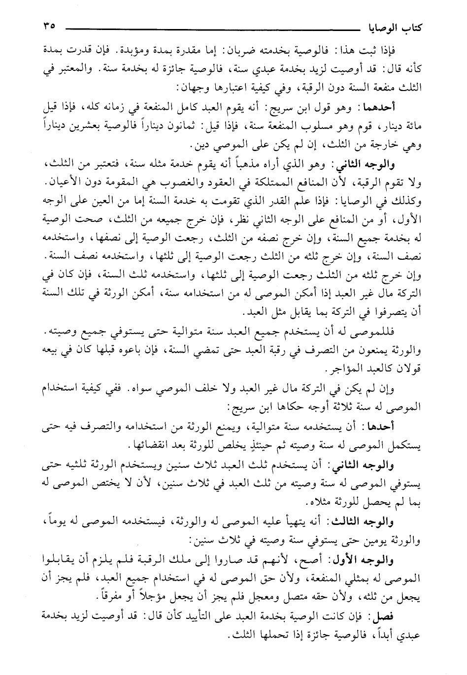 والوجه الثاني: وهو الذي أراه مذهبًا أنه يقوم خدمة مثله سنة، فتعتبر من الثلث، ولا تقوم الرقبة، لأن المنافع الممتلكة في العقود والغصوب هي المقومة دون الأعيان. وكذلك في الوصايا: فإذا علم القدر الذي تقومت به خدمة السنة إما من العين على الوجه الأول، أو من المنافع على الوجه الثاني نظر، فإن خرج جميعه من الثلث، صحت الوصية له بخدمة جميع السنة، وإن خرج نصفه من الثلث، رجعت الوصية إلى نصفها، واستخدمه نصف السنة، وإن خرج ثلثه من الثلث رجعت الوصية إلى ثلثها، واستخدمه نصف السنة. وإن خرج ثلثه من الثلث رجعت الوصية إلى ثلثها، واستخدمه ثلث السنة، فإن كان في التركة مال غير العبد إذا أمكن الموصي له من استخدامه سنة، أمكن الورثة في تلك السنة أن يتصرفوا في التركة بما يقابل مثل العبد.