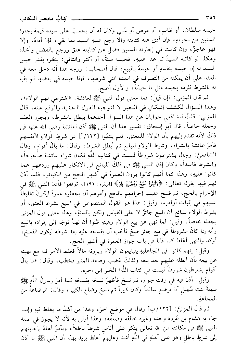 ثم قال المزني: فإن قيل: فما معنى قول النبي - صلى الله عليه وسلم - لعائشة: «اشترطي لهم الولاء»، وهذا السؤال لكشف إشكال في الخبر لا لتوجيه القول الجديد والرفع عنه، قال المزني: قلت للشافعي جوابان عن هذا السؤال أحدهما يبطل بالشرط، ويجوز العقد وجعله خاصًا. قال أبو إسحاق: تفسير هذا أن النبي - صلى الله عليه وسلم - أذن لعائشة رضي الله عنها في ذلك لأنه تقدم إليهم بأن الولاء للمعتق، فلم ينتهوا [122/ أ] عن شرط الولاء لأنفسهم فأمر عائشة بالشراء، وشرط الولاء للبائع ثم أبطل الشرط، وقال: ما بال أقوام، وقال الشافعي: رجال يشترطون شروطًا ليست في كتاب الله فكان شراء عائشة صحيحًا، والشرط فاسدًا، وكان إذن النبي - صلى الله عليه وسلم - في ذلك للبائع في الإنكار عليهم وردعهم عما كانوا عليه، وهذا كما أنهم كانوا يرون العمرة في أشهر الحج من الكبائر، فلما أذن لهم فيها بقوله تعالى: {وأَتِمُّوا الحَجَّ والْعُمْرَةَ لِلَّهِ} [البقرة: 196]، توقفوا فأذن النبي - صلى الله عليه وسلم - في الإحرام بالحج، ثم فسخ عليهم إحرامهم بالحج وأمرهم أن يجعلوه عمرة ليكون تغليطًا عليهم في إثبات أوامره، وقيل: هذا هو القول المنصوص في البيع بشرط العتق، أو بشرط الولاء للبائع أن البيع جائز لا على القياس ولكن بالسنة، وهذا معنى قول المزني يجعله خاصًا. وقيل: لما نهى عن بيع الولاء وهبته ظنوا أن نهيه توجه إلى إفراه بالبيع وأنه إذا كان مشروطًا في بيع جائز صح فأحب أن يفسخه عليه بعد شرطه ليكون الفسخ، أوكد والنهي أغلط كما قلنا في باب جواز العمرة في أشهر الحج.