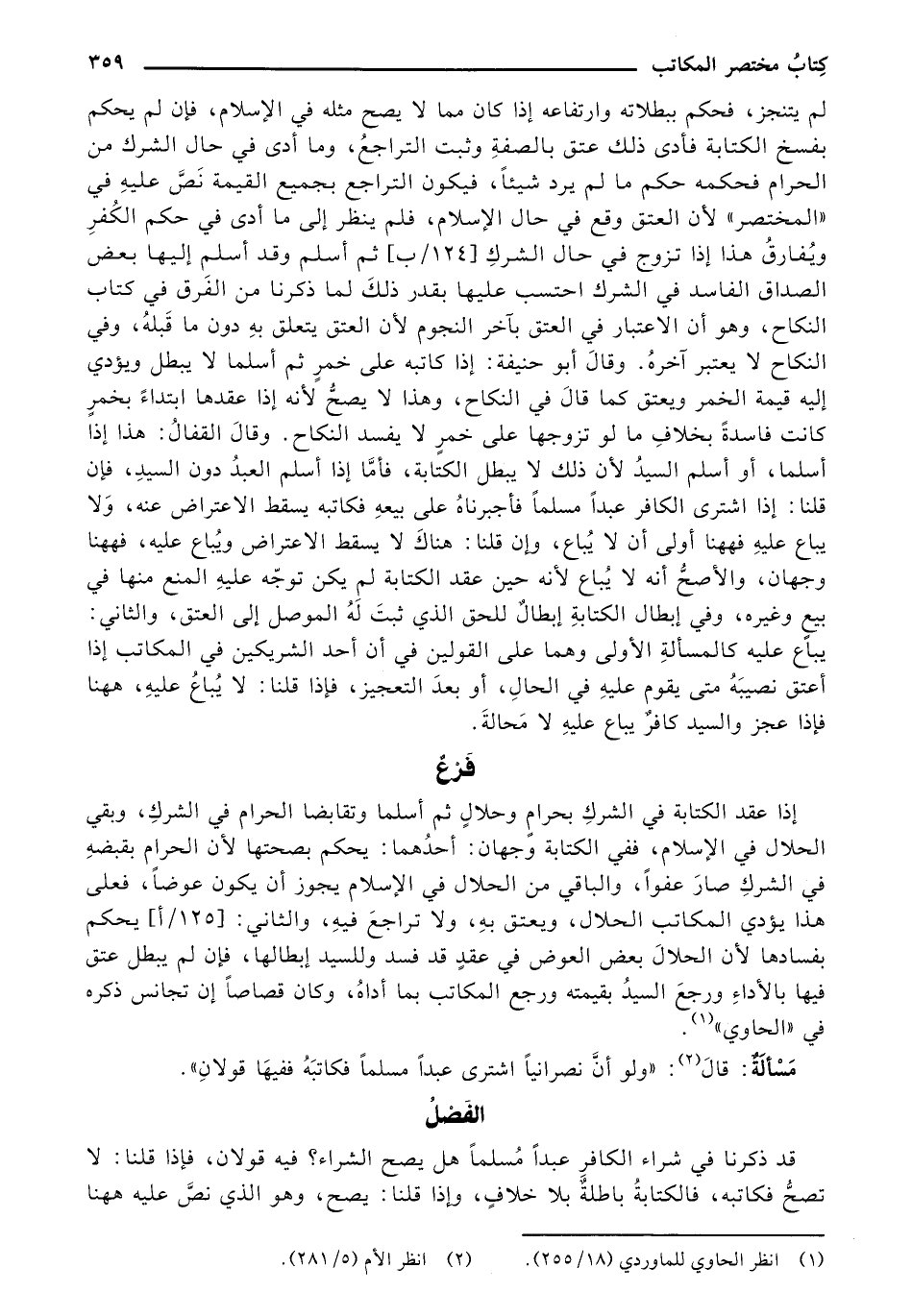 إذا عقد الكتابة في الشرك بحرام وحلال ثم أسلما وتقابضا الحرام في الشرك، وبقي الحلال في الإسلام ففي الكتابة وجهان: أحدهما: يحكم بصحتها لأن الحرام بقبضه في الشرك صار عفوًا، والباقي من الحلال في الإسلام يجوز أن يكون عوضًا، فعلى هذا يؤدي المكاتب الحلال، ويعتق به، ولا تراجع فيه، والثاني: [125/ أ] يحكم بفسادها لأن الحلال بعض العوض في عقد قد فسد وللسيد إبطالها، فإن لم يبطل عتق فيها بالأداء ورجع السيد بقيمته ورجع المكاتب بما أداه، وكان قصاصًا إن تجانس ذكره في «الحاوي».