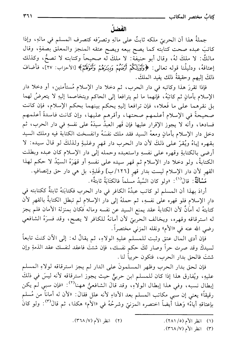 فإن لحق بدار الحرب وظهر المسلمون على الدار لم يجز استرقاقه لولاء المسلم عليه، ويفارق هذا إذا كان للمسلم ابن حربي حيث يجوز استرقاقه لأنه ليس في ذلك إبطال نسبه، وفي هذا إبطال الولاء، وقد قال الشافعي ههنا: «فإن سبي لم يكن رقيقًا» يعني إن سبي مكاتب المسلم بعد الأداء لأنه علل فقال: «لأن له أمانًا من مسلم بإعتاقه إياه» وهذا أيضًا اختصره المزني وشرحه في «الأم» هكذا، ثم قال: ولو كان