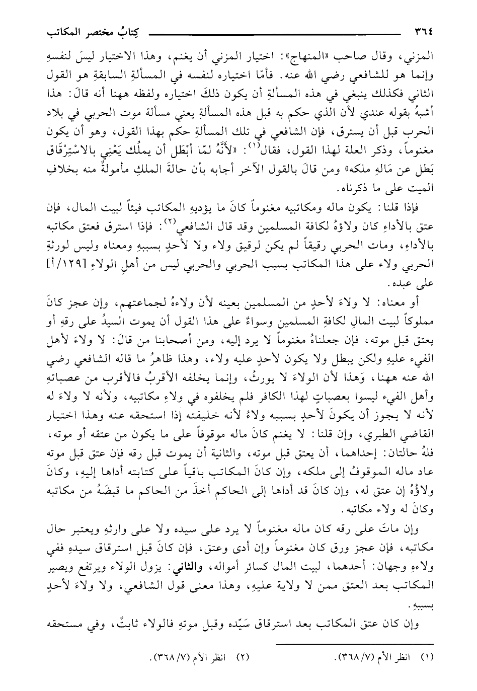 المزني، وقال صاحب «المنهاج»: اختيار المزني أن يغنم، وهذا الاختيار ليس لنفسه وإنما هو للشافعي رضي الله عنه. فأما اختياره لنفسه في المسألة السابقة هو القول الثاني فكذلك ينبغي في هذه المسألة أن يكون ذلك اختياره ولفظه ههنا أنه قال: هذا أشبه بقوله عندي لأن الذي حكم به قبل هذه المسألة يعني مسألة موت الحربي في بلاد الحرب قبل أن يسترق، فإن الشافعي في تلك المسألة حكم بهذا القول، وهو أن يكون مغنومًا، وذكر العلة لهذا القول، فقال: «لأنه لما أبطل أن يملك يعني بالاسترقاق بطل عن ماله ملكه» ومن قال بالقول الآخر أجابه بأن حالة الملك مأمولة منه بخلاف الميت على ما ذكرناه.