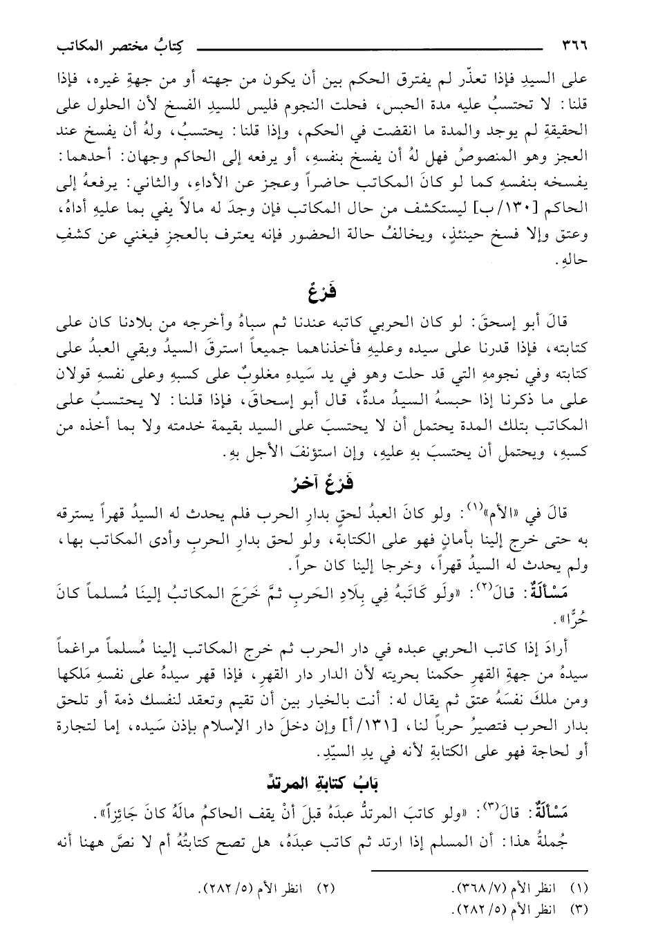 قال في «الأم»: ولو كان العبد لحق بدار الحرب فلم يحدث له السيد قهرًا يسترقه به حتى خرج إلينا بأمان فهو على الكتابة، ولو لحق بدار الحرب وأدى المكاتب بها، ولم يحدث له السيد قهرًا، وخرجا إلينا كان حرًا.