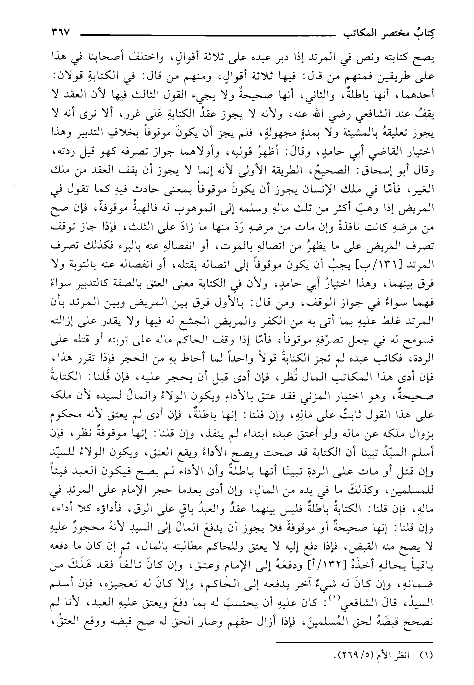 يصح كتابته ونص في المرتد إذا دبر عبده على ثلاثة أقوال، واختلف أصحابنا في هذا على طريقين فمنهم من قال: فيها ثلاثة أقوال، ومنهم من قال: في الكتابة قولان: أحدهما، أنها باطلة، والثاني، أنها صحيحة ولا يجيء القول الثالث فيها لأن العقد لا يقف عند الشافعي رضي الله عنه، ولأنه لا يجوز عقد الكتابة على غرر، ألا ترى أنه لا يجوز تعليقه بالمشيئة ولا بمدة مجهولة، فلم يجز أن يكون موقوفًا بخلاف التدبير وهذا اختيار القاضي أبي حامد، وقال: أظهر قوليه، وأولاهما جواز تصرفه كهو قبل ردته، وقال أبو إسحاق: الصحيح، الطريقة الأولى لأنه إنما لا يجوز أن يقف العقد من ملك الغير، فأما في ملك الإنسان يجوز أن يكون موقوفًا بمعنى حادث فيه كما تقول في المريض إذا وهب أكثر من ثلث ماله وسلمه إلى الموهوب له فالهبة موقوفة، فإن صح من مرضه كانت نافذة وإن مات من مرضه رد منها ما زاد على الثلث، فإذا جاز توقف تصرف المريض على ما يظهر من اتصاله بالموت، أو انفصاله عنه بالبرء فكذلك تصرف المرتد [131/ب] يجب أن يكون موقوفًا إلى اتصاله بقتله، أو انفصاله عنه بالتوبة ولا فرق بينهما، وهذا اختيار أبي حامد، ولأن في الكتابة معنى العتق بالصفة كالتدبير سواء فهما سواء في جواز الوقف، ومن قال: بالأول فرق بين المريض وبين المرتد بأن المرتد غلط عليه بما أتى به من الكفر والمريض الجشع له فيها ولا يقدر على إزالته فسومح له في جعل تصرفه موقوفًا، فأما إذا وقف الحاكم ماله على توبته أو قتله على الرده، فكاتب عبده لم تجز الكتابة قولا واحدًا لما أحاط به من الحجر فإذا تقرر هذا، فإن أدى هذا المكاتب المال نظر، فإن أدى قبل أن يحجر عليه، فإن قلنا: الكتابة صحيحة، وهو اختيار المزني ف قد عتق بالأداء ويكون الولاء والمال لسيده لأنه ملكه على هذا القول ثابت على ماله، وإن قلنا: إنها باطلة، فإن أدى لم يعتق لأنه محكوم بزوال ملكه عن ماله ولو أعتق عبده ابتداء لم ينفذ، وإن قلنا: إنها موقوفة نظر، فإن أسلم السيد تبينا أن الكتابة قد صحت ويصح الأداء ويقع العتق، ويكون الولاء للسيد وإن قتل أو مات على الردة تبينا أنها باطلة وأن الأداء لم يصح فيكون العبد فيئًا للملمين، وكذلك ما في يده من المال، وإن أدى بعدما حجر الإمام على المرتد في ماله، فإن قلنا: الكتابة باطلة فليس بلينهما عقد والعبد باق على الرق، فأداؤه كلا أداء، وإن قلنا: إنها صحيحة أو موقوفة فلا يجوز أن يدفع المال إلى السيد لأنه محجور عليه لا يصح منه القبض، فإذا دفع إليه لا يعتق وللحاكم مطالبته بالمال، ثم إن كان ما دفعه باقيًا بحاله أخذه [132/أ] ودفعه إلى الإمام وعتق، وإن كان تالفًا فقد هلك من ضمانه، وإن كان له شيء آخر يدفعه إلى الحاكم، وإلا كان له تعجيزه، فإن أسلم السيد، قال الشافعي: كان عليه أن يحتسب له بما دفع ويعتق عليه العبد، لأنا لم نصحح قبضه لحق المسلمين، فإذا أزال حقهم وصار الحق له صح قبضه ووقع العتق،