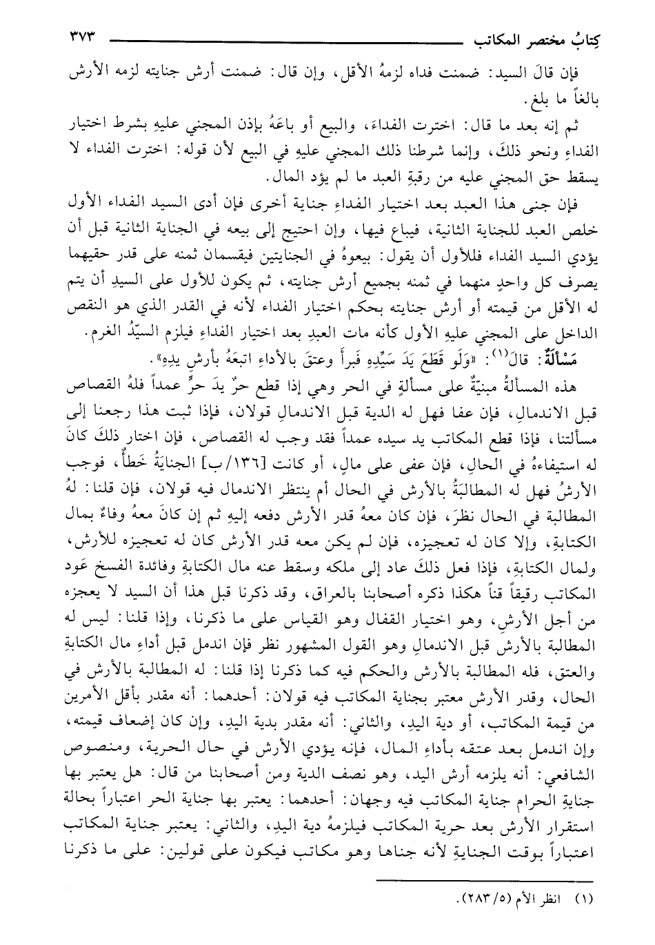 هذه المسألة مبنية على مسألة في الحر وهي إذا قطع حر يد حر عمدًا فله القصاص قبل الاندمال فإن عفا فهل له الدية قبل الاندمال قولان، فإذا ثبت هذا رجعنا إلى مسألتنا، فإذا قطع المكاتب يد سيده عمدًا فقد وجب له القصاص، فإن اختار ذلك كان له استيفاءه في الحال، فإن عفى على مال، أو كانت [136/ب] الجناية خطأ، فوجب الأرش فهل له المطالبة بالأرش في الحال أم ينتظر الاندمال فيه قولان: فإن قلنا: له المطالبة في الحال نظر، فإن كان معه قدر الأرش دفعه إليه ثم إن كان معه وفاء بمال الكتابة، وإلا كان له تعجيزه، فإن لم يكن معه قدر الأرش كان له تعجيزه للأرش، ولمال الكتابة، فإذا فعل ذلك عاد إلى ملكه وسقط عنه مال الكتابة وفائدة الفسخ عود المكاتب رقيقًا قنا هكذا ذكره أصحابنا بالعراق، وقد ذكرنا قبل هذا أن السيد لا يعجزه من أجل الأرش، وهو اختيار القفال وهو القياس على ما ذكرنا، وإذا قلنا: ليس له المطالبة بالأرش قبل الاندمال وهو القول المشهور نظر فإن اندمل قبل أداء مال الكتابة والعتق، فله المطالبة بالأرش والحكم فيه كما ذكرنا إذا قلنا: له المطالبة بالأرش في الحال، وقدر الأرش معتبر بجناية المكاتب فيه قولان: أحدهما: أنه مقدر بأقل الأمرين من قيمة المكاتب، أو دية اليد، والثاني: أنه مقدر بدية اليد، وإن كان إضعاف قيمته، وإن اندمل بعد عتقه بأداء المال، فإنه يؤدي الأرش في حال الحرية، ومنصوص الشافعي: أنه يلزمه أرش اليد، وهو نصف الدية ومن أصحابنا من قال: هل يعتبر بها جناية الحرام جناية المكاتب فيه وجهان: أحدهما: يعتبر بها جناية الحر اعتبارًا بحالة استقرار الأرش بعد حرية المكاتب فيلزمه دية اليد، والثاني: يعتبر جناية المكاتب اعتبارًا بوقت الجناية لأنه جناها وهو مكاتب فيكون على قولين: على ما ذكرنا