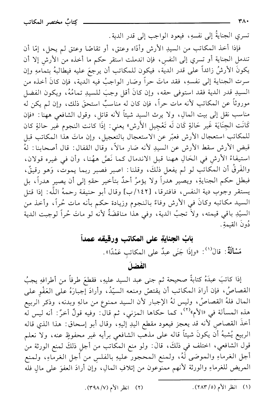إذا كاتب عبده كتابة صحيحة ثم جني عبد السيد عليه، فقطع طرفًا من أطرافه يجب القصاص، فإن أراد المكاتب أن يقتص ومنعه السيد، وأراد إجباره على العفو على المال فله القصاص، وليس له الإجبار لأن السيد ممنوع من ماله وبدنه، وذكر الربيع هذه المسألة في «الأم»، كما حكاها المزني، ثم قال: وفيه قول آخر: أنه ليس له أخذ القصاص لأنه قد يعجز فيعود مقطع اليد إليه، وقال أبو إسحاق: هذا الذي قاله الربيع يشبه أن يكون شيئًا قاله على مذهب الشافعي برأيه غير محفوظ عنه، ولا نعلم قول الشافعي، اختلف في ذلك، قال: ولو منع المكاتب من أجل ذلك لمنع الورثة من أجل الغرماء والموصي له، ولمنع المحجور عليه بالفلس من أجل الغرماء، ولمنع المريض للغرماء والورثة لأنهم ممنوعون من إتلاف المال، وإن أراد العفو على مال فله