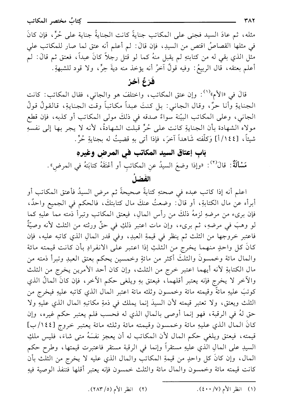 مثله، ثم عاد السيد فجني على المكاتب جناية كانت الجناية جناية على حر، فإن كان في مثلها القصاص اقتص من السيد، فإن قال: لم أعلم أنه عتق لما صار للمكاتب علي مثل الذي بقي له من كتابته لم يقبل منه كما لو قتل رجلًا كان عبدًا، فعتق ثم قال: لم أعلم بعتقه، قال الربيع: وفيه قول آخر أنه يؤخذ منه دية حر، ولا قود للشبهة.