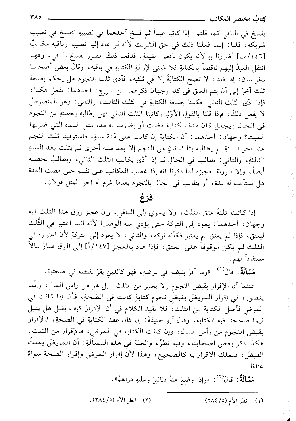 عندنا أن الإقرار بقبض النجوم ولا يعتبر من الثلث، بل هو من رأس المال، وإنما يتصور، في إقرار المريض بقبض نجوم كتابة كانت في الصحة، فأما إذا كانت في المرض فأصل الكتابة من الثلث، فلا يفيد الكلام في أن الإقرار كيف يقبل هل يقبل فيما صححنا فيه الكتابة، وقال أبو حنيفة: إن كان عقد الكتابة في الصحة، فالإقرار بقبض النجوم من رأس المال، وإن كانت الكتابة في المرض، فالإقرار من الثلث. هكذا ذكر بعض أصحابنا، وفيه نظر، والعلة في هذه المسألة: أن المريض يملك القبض، فيملك الإقرار به كالصحيح، وهذا لأن إقرار المرض وإقرار الصحة سواء عندنا.