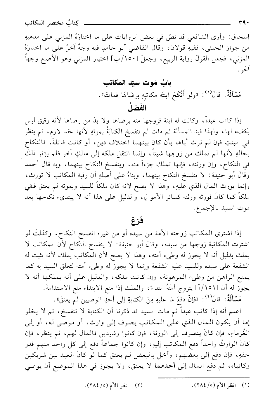 إذا كاتب عبدًا، وكانت له ابنة فزوجها منه برضاها ولا بد من رضاها لأنه رقيق ليس بكفء لها، ولهذا قيد المسألة ثم مات لم تنفسخ الكتابة بموته لأنها عقد لازم، ثم ينظر في البنت فإن لم ترث أباها بأن كان بينهما اختلاف دين، أو كانت قاتلة، فالنكاح بحالة لأنها لم تملك من زوجها شيئًا، وإنما انتقل ملكه إلى مالكٍ آخر فلم يؤثر ذلك في النكاح، وإن ورثته، فإنه تملك جزءًا منه، وينفسخ النكاح بينهما، وبه قال أحمد وقال أبو حنيفة: لا ينفسخ النكاح بينهما، وبناه على أصله أن رقبة المكاتب لا تورث، وإنما يورث المال الذي عليه، وهذا لا يصح لأنه كان ملكًا للسيد وبموته لم يعتق فبقي ملكًا كما كان فورثه ورثته كسائر الأموال، والدليل على هذا أنه لا يبتدئ نكاحها بعد موت السيد بالإجماع.