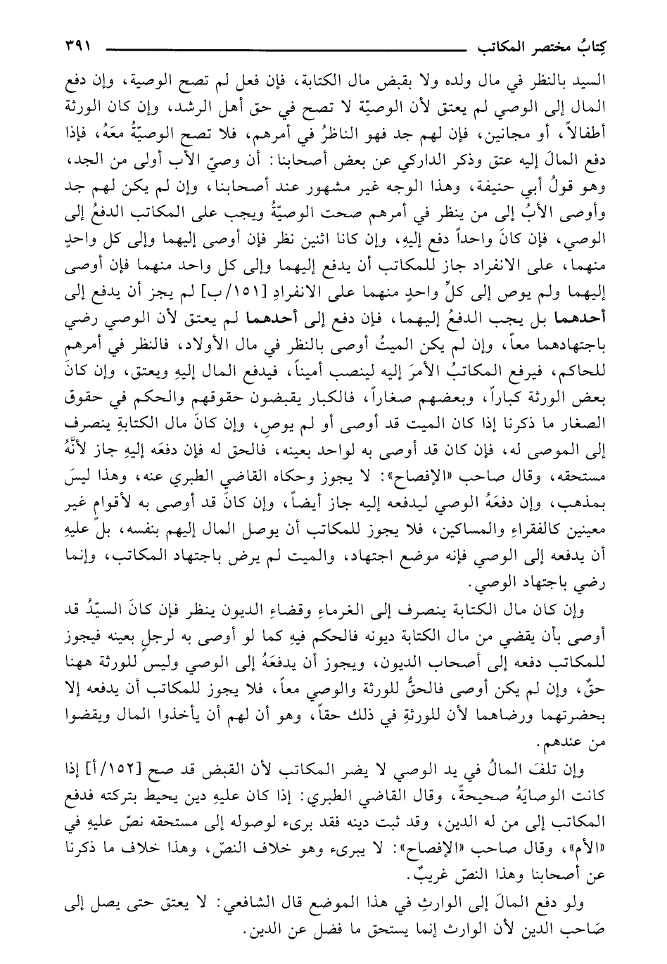 السيد بالنظر في مال ولده ولا يقبض مال الكتابة، فإن فعل لم تصح الوصية، وإن دفع المال إلى الوصي لم يعتق لأن الوصية لا تصح في حق أهل الرشد، وإن كان الورثة أطفالًا، أو مجانين، فإن لهم جد فهو الناظر في أمرهم، فلا تصح الوصية معه، فإذا دفع المال إليه عتق وذكر الداركي عن بعض أصحابنا: أن وصي الأب أولى من الجد، وهو قول أبي حنيفة، وهذا الوجه غير مشهور عند أصحابنا، وإن لم يكن لهم جد وأوصي الأب إلى من ينظر في أمرهم صحت الوصية ويجب على المكاتب الدفع إلى الوصي، فإن كان واحدًا دفع إليه، وإن كانا اثنين نظر فإن أوصى إليهما وإلى كل واحدٍ منهما، على الانفراد جاز للمكاتب أن يدفع إليهما وإلى كل واحد منهما فإن أوصى إليهما ولم يوص إلى كل واحد منهما على الانفراد [151/ ب] لم يجز أن يدفع إلى أحدهما بل يجب الدفع إليهما، فإن دفع إلى أحدهما لم يعتق لأن الوصي رضي باجتهادهما معًا، وإن لم يكن الميت أوصى بالنظر في مال الأولاد، فالنظر في أمرهم للحاكم، فيرفع المكاتب الأمر إليه لينصب أمينًا، فيدفع المال إليه ويعتق، وإن كان بعض الورثة كبارًا، وبعضهم صغارًا، فالكبار يقضبون حقوقهم والحكم في حقوق الصغار ما ذكرنا إذا كان الميت قد أوصى أو لم يوص، وإن كان مال الكتابة ينصرف إلى الموصى له، فإن كان قد أوصى به لواحد بعينه، فالحق له فإن دفعه إليه جاز لأنه مستحقه، وقال صاحب «الإفصاح»: لا يجوز وحكاه القاضي الطبرى عنه، وهذا ليس بمذهب، وإن دفعه الوصي ليدفعه إليه جاز أيضًا، وإن كان قد أوصى به لأقوام غير معينين كالفقراء والمساكين، فلا يجوز للمكاتب أن يوصل المال إليهم بنفسه، بل عليه أن يدفعه إلى الوصي فإنه موضع اجتهاد، والميت لم يرض باجتهاد المكاتب، وإنما رضي باجتهاد الوصي.