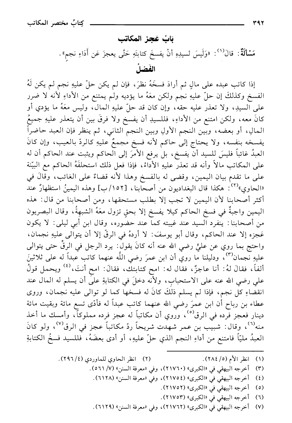 إذا كاتب عبده على مالٍ ثم أراد فسخه نظر، فإن لم يكن حل عليه نجم لم يكن له الفسخ وكذلك إن حل عليه نجم ولكن معه ما يؤديه ولم يمتنع من الأداء لأنه لا ضرر على السيد، ولا تعذر عليه حقه، وإن كان قد حل عليه المال، وليس معه ما يؤدي أو كان معه، ولكن امتنع من الأداء، فللسيد أن يفسخ ولا فرق بين أن يتعذر عليه جميع المال، أو بعضه، وبين النجم الأول وبين النجم الثاني، ثم ينظر فإن العبد حاضرًا يفسخه بنفسه، ولا يحتاج إلى حاكم لأنه فسخ مجمع عليه كالرد بالعيب، وإن كان العبد غائبًا فليس للسيد أن يفسخ، بل يرفع الأمر إلى الحاكم ويثبت عند الحاكم أن له على المكاتب مالًا وأنه قد تعذر عليه الأداء، فإذا فعل ذلك استحلفه الحاكم مع البينة على ما تقدم بيان اليمين، وقضي له بالفسخ وهذا لأنه قضاء على الغائب، وقال في «الحاوي»: هكذا قال البغداديون من أصحابنا، [152/ ب] وهذه اليمين استظهار عند أكثر أصحابنا لأن ليمين لا تجب إلا بطلب مستحقها، ومن أصحابنا من قال: هذه اليمين واجبة في فسخ الحاكم كيلًا يفسخ إلا بحق تزول معه الشبهة، وقال البصريون من أصحابنا: ينفرد السيد عند غيبته كما عند حضوره، وقال ابن أبي ليلي: لا يكون عجزه إلا عند الحاكم، وقال أبو يوسف: لا أرده في الرق إلا أن يتوالى عليه نجمان، واحتج بما روى عن علي رضي الله عنه أنه كان يقول: يرد الرجل في الرق حتى يتوالي عليه نجمان، ودليلنا ما روي أن ابن عمر رضي الله عنهما كاتب عبدًا له على ثلاثين ألفًا، فقال له: أنا عاجز، فقال له: امح كتابتك، فقال: امح أنت، ويحمل قول علي رضي الله عنه على الاستحباب، ولأنه دخل في الكتابة على أن يسلم له المال عند انقضاء كل نجم، فإذا لم يسلم ذلك كان له فسخها كما لو توالى عليه نجمان، وروي عطاء بن رباح أن ابن عمر رضي الله عنهما كاتب عبدًا له فأدي تسع مائة وبقيت مائة دينار فعجز فرده في الرق، وروي أن مكاتبًا له عجز فرده مملوكًا، وأمسك ما أخذ منه، وقال: شبيب بن عمر شهدت شريحًا رد مكاتبًا عجز في الرق، ولو كان العبد مليًا فامتنع من أداء النجم الذي حل عليه، أو أدي بعضه فللسيد فسخ الكتابة