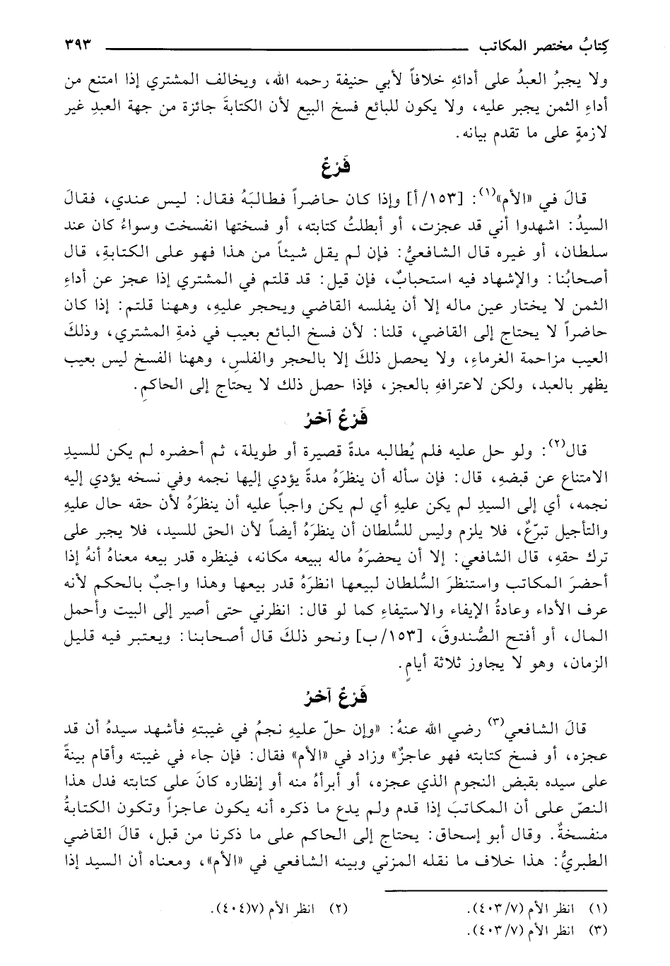 قال: ولو حل عليه فلم يطالبه مدة قصيرة أو طويلة، ثم أحضره لم يكن للسيد الامتناع عن قبضه، قال: فإن سألته أن ينظره مدة يؤدي إليها نجمة وفي نسخة يؤدي إليه نجمه، أي إلى السيد لم يكن عليه أي لم يكن واجبًا عليه أن ينظره لأن حقه حال عليه والتأجيل تبرع، فلا يلزم وليس للسلطان أن ينظره أيضًا لأن الحق للسيد، فلا يجبر على ترك حقه، قال الشافعي: إلا أن يحضره ماله ببيعه مكانه، فينظره قدر بيعه معناه أنه إذا أحضر المكاتب واستنظر السلطان لبيعها أنظره قدر بيعها وهذا واجب بالحكم لأنه عرف الأداء وعادة الإيفاء والاستيفاء كما لو قال: أنظرني حتى أصير إلى البيت وأحمل المال، أو أفتح الصندوق، [153/ ب] ونحو ذلك قال أصحابنا: ويعتبر فيه قليل الزمان، وهو لا يجاوز ثلاثة أيام.
