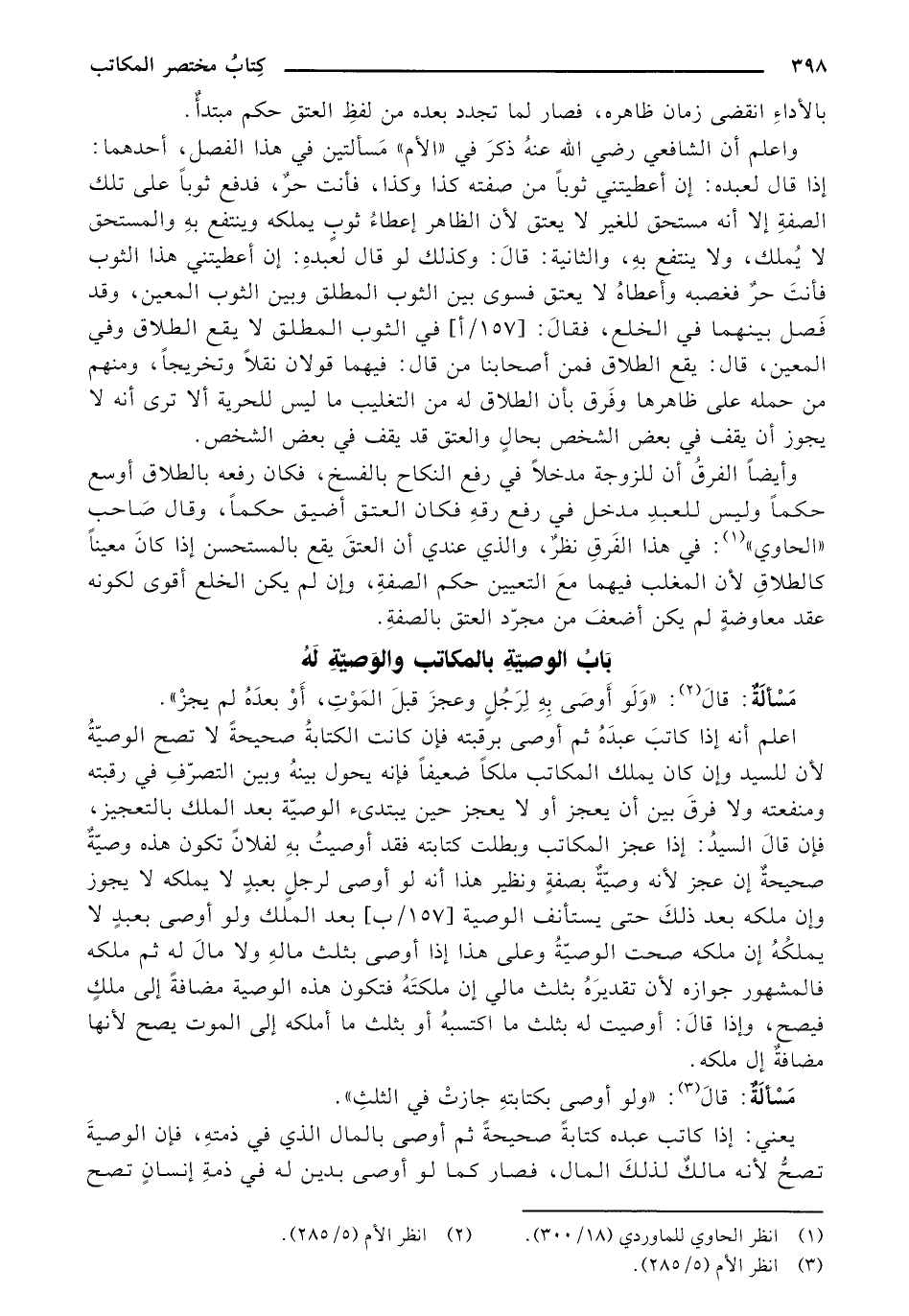 أعلم أنه إذا كاتب عبده ثم أوصى برقبته فإن كانت الكتابة صحيحة لا تصح الوصية لأن للسيد وإن كان يملك المكاتب ملكًا ضعيفًا فإنه يحول بينه وبين التصرف في رقبته ومنفعته ولا فرق بين أن يعجز أو لا يعجز حين يبتديء الوصية بعد الملك بالتعجيز، فإن قال السيد: إذا عجز المكاتب وبطلت كتابته فقد أوصيت به لفلان تكون هذه وصية صحيحة إن عجز لأنه وصية بصفة ونظير هذا أنه لو أوصي لرجل بعبد لا يملكه لا يجوز وإن ملكه بعد ذلك حتى يستأنف الوصية [157/ ب] بعد الملك ولو أوصي بعبد لا يملكه إن ملكه صحت الوصية وعلى هذه إذا أوصي بثلث ماله ولا مال له ثم ملكه فالمشهور جوازه لأن تقديره بثلث مالي إن مكلته فتكون هذه الوصية مضافة إلى ملك فيصح، وإذا قال: أوصيت له بثلث ما اكتسبه أو بثلث ما أملكه إلى الموت يصح لأنها مضافة إلى ملكه.