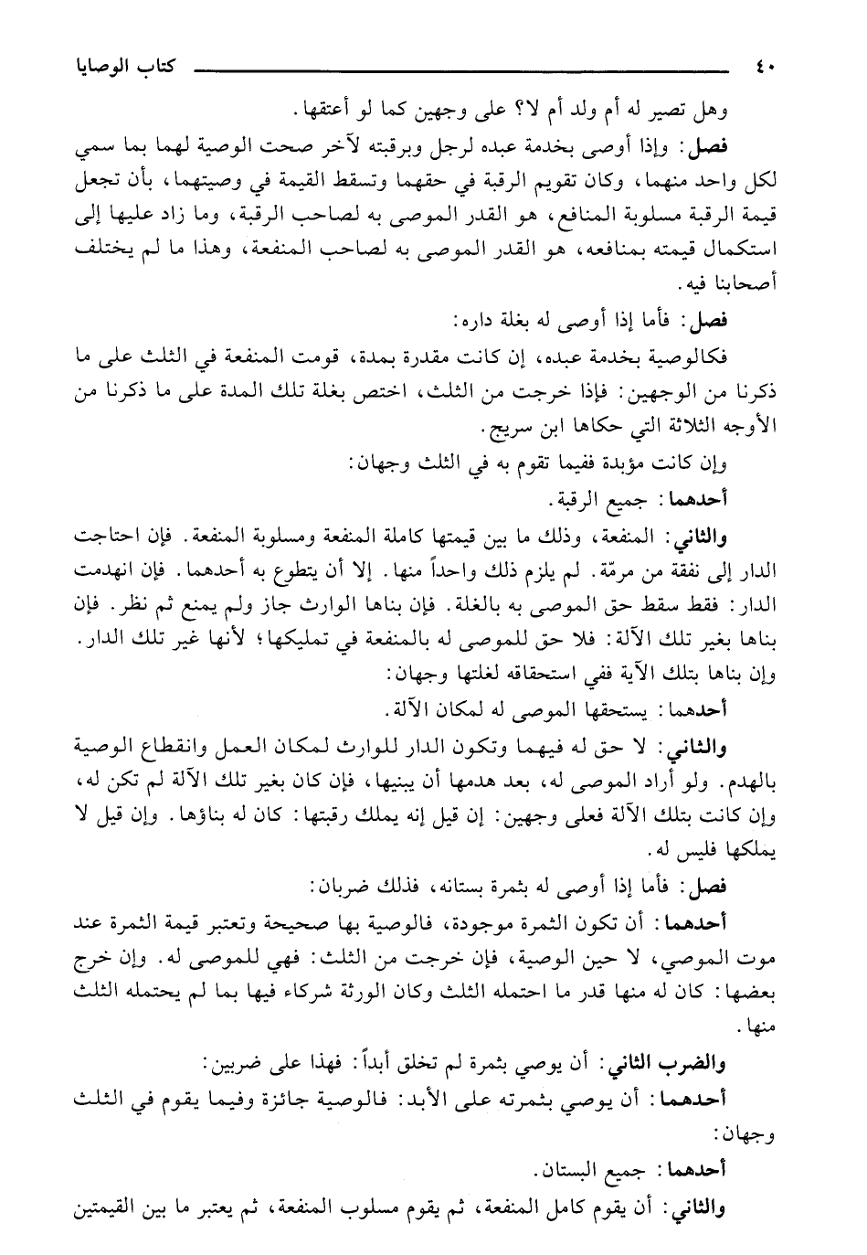 فصل: وإذا أوصي بخدمة عبده لرجل وبرقبته لآخر صحت الوصية لهما بما سمي لكل واحد منهما، وكان تقويم الرقبة في حقهما وتسقط القيمة في وصيتهما، بأن تجعل قيمة الرقبة مسلوبة المنافع، هو القدر الموصي به لصاحب الرقبة، وما زاد عليها إلى استكمال قيمته بمنافعه، هو القدر الموصي به لصاحب المنفعة، وهذا ما لم يختلف أصحابنا فيه.