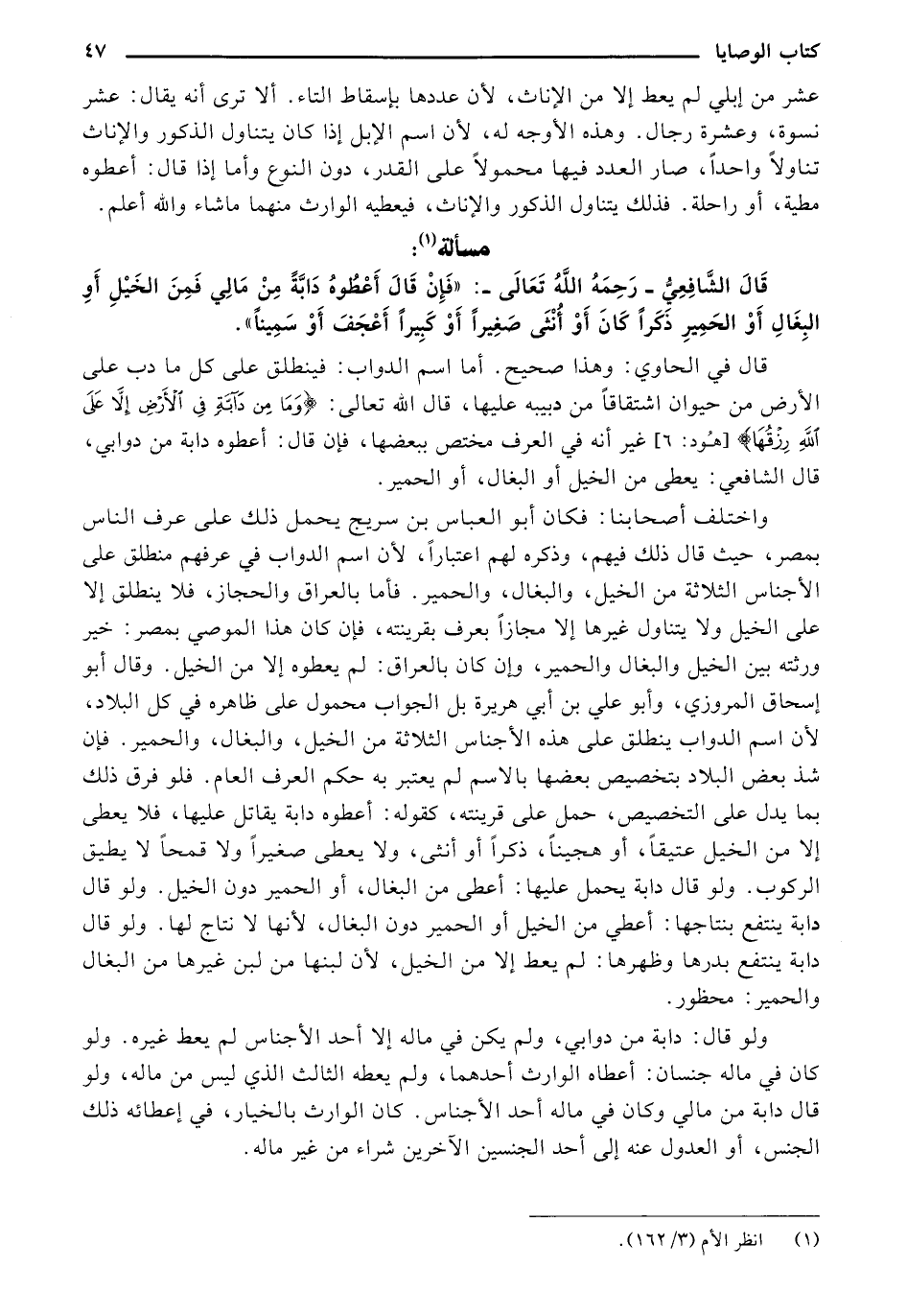 واختلف أصحابنا: فكان أبو العباس بن سريج يحمل ذلك على عرف الناس بمصر، حيث قال ذلك فيهم، وذكره لهم اعتبارًا، لأن اسم الدواب في عرفهم منطلق على الأجناس الثلاثة من الخيل، والبغال، والحمير. فأما بالعراق والحجاز، فلا ينطلق إلا على الخيل ولا يتناول غيرها إلا مجازًا بعرف بقرينته، فإن كان هذا الموصي بمصر: خير ورثته بين الخيل والبغال والحمير، وإن كان بالعراق: لم يعطوه إلا من الخيل. وقال أبو إسحاق المروزي، وأبو علي بن أبي هريرة بل الجواب محمول على ظاهرة في كل البلاد، لأن اسم الدواب ينطلق على هذه الأجناس الثلاثة من الخيل، والبغال، والحمير. فإن شذ بعض البلاد بتخصيص بعضها بالاسم لم يعتبر به حكم العرف العام. فلو فرق ذلك بما يدل على التخصيص، حمل على قرينته، كقوله: أعطوه دابة يقاتل عليها، فلا يعطي إلا من الخيل عتيقًا، أو هجينًا، ذكرًا أو أنثي، ولا يعطي صغيرًا ولا قمحًا لا يطيق الركوب. ولو قال دابة يحمل عليها: أعطي من البغال، أو الحمير دون الخيل. ولو قال دابة ينتفع بنتاجها: أعطي من الخيل أو الحمير دون البغال، لأنها لا نتاج لها. ولو قال دابة ينتفع بدرها وظهرها: لم يعط إلا من الخيل، لأن لبنها من لبن غيرها من البغال والحمير: محظور.