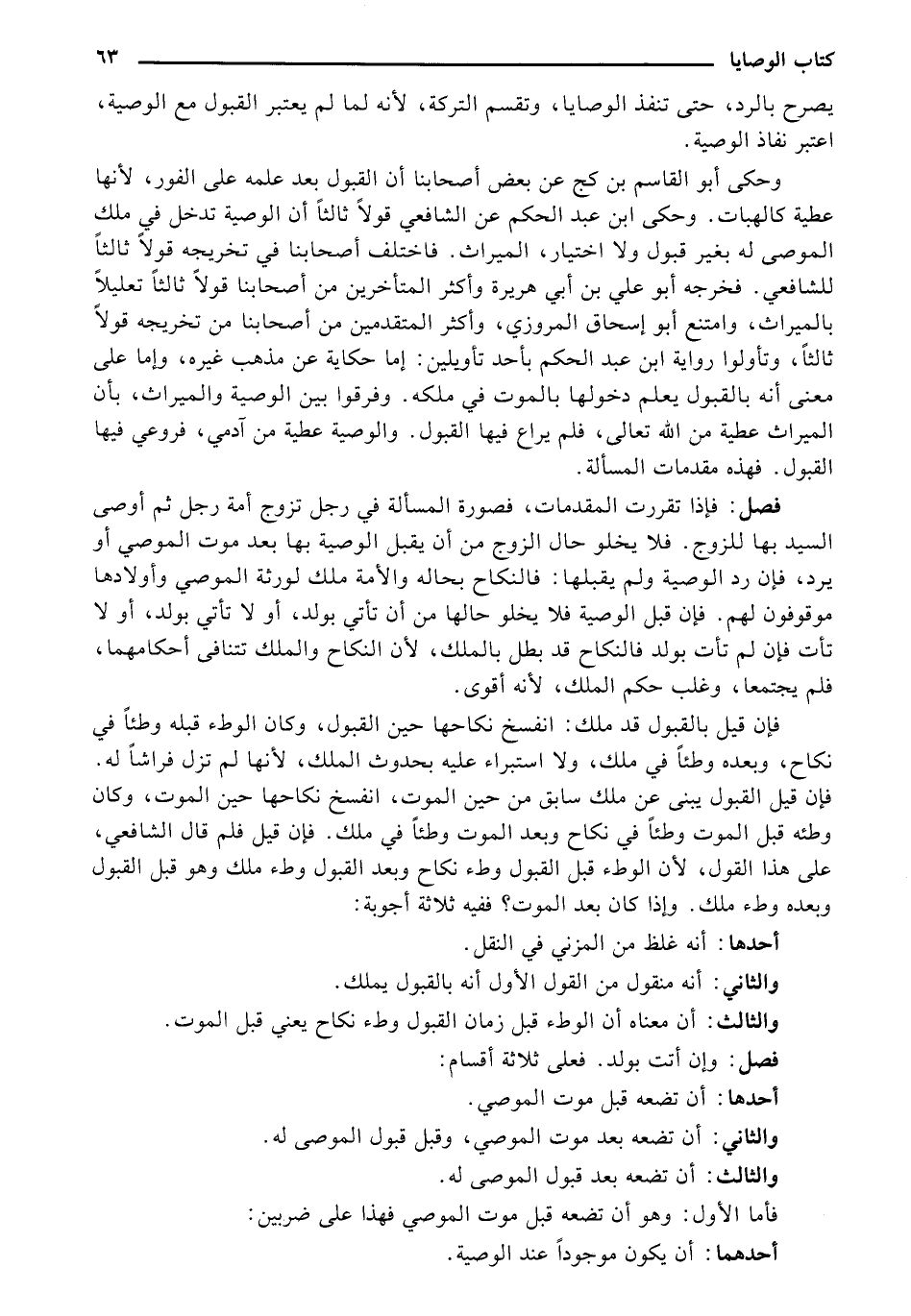 وحكي أبو القاسم بن كج عن بعض أصحابنا أن القبول بعد علمه على الفور، لأنها عطية كالهبات. وحكي ابن عبد الحكم عن الشافعي قولًا ثالثًا أن الوصية تدخل في ملك الموصي له بغير قبول ولا اختيار، الميراث. فاختلف أصحابنا في تخريجه قولًا ثالثًا للشافعي. فخرجه أبو علي بن أبي هريرة وأكثر المتأخرين من أصحابنا قولًا ثالثًا تعليلًا بالميراث، وامتنع أبو إسحاق المروزي، وأكثر المتقدمين من أصحابنا من تخريجه قولًا ثالثًا، وتأولوا رواية ابن عبد الحكم بأحد تأويلين: إما حكاية عن مذهب غيره، وإما على معني أنه بالقبول يعلم دخولها بالموت في ملكه. وفرقوا بين الوصية والميراث، بأن الميراث عطية من الله تعالى، فلم يراع فيها القبول. والوصية عطية من آدمي، فروعي فيها القبول. فهذه مقدمات المسألة.